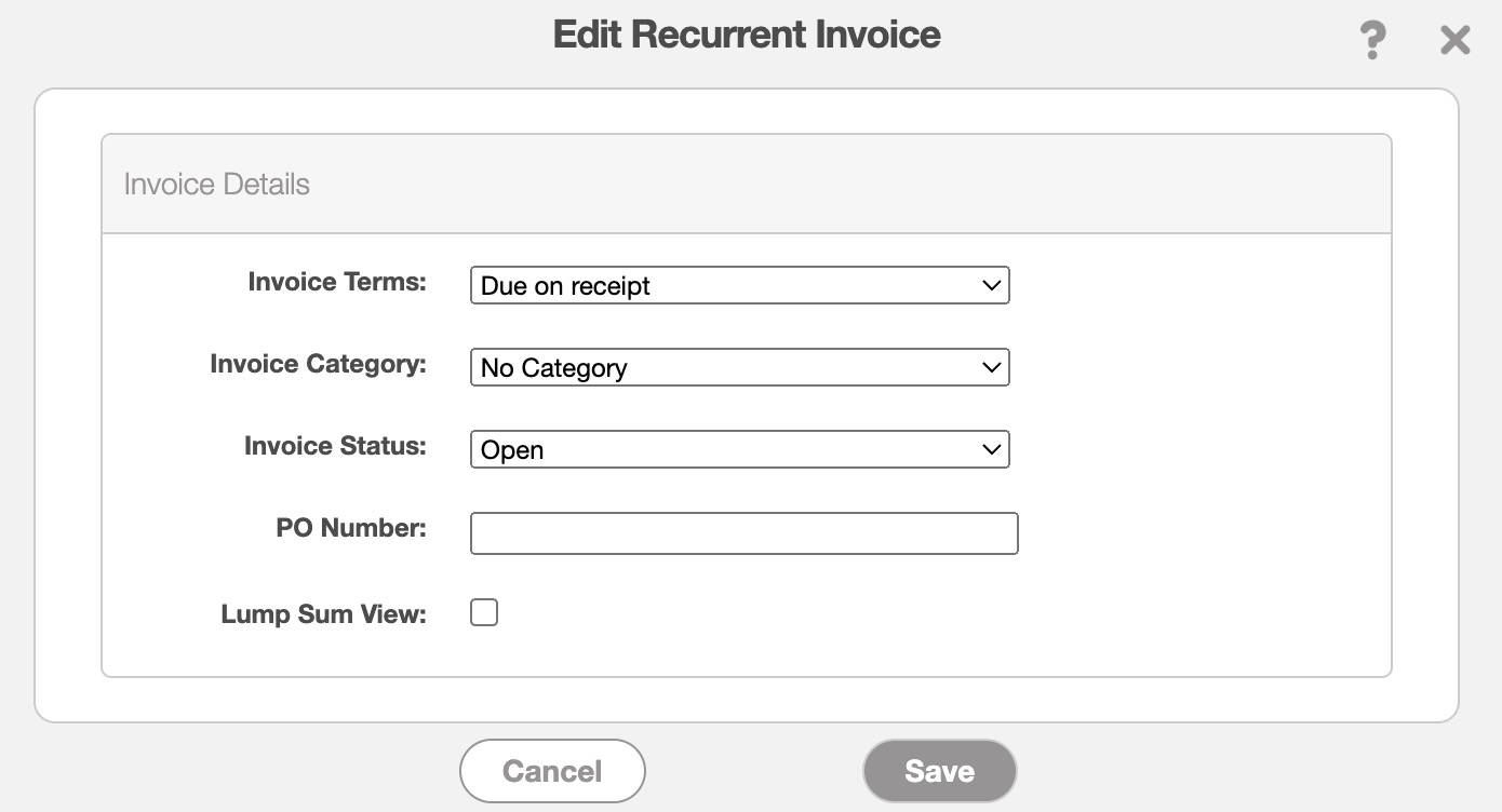 If you would like to only edit the billing address or billing details of a recurrent invoice, you will be able to do so through the View Recurrent Invoice pop-up window. To see how to access this pop-up window, please see the View a Recurrent Invoice page.