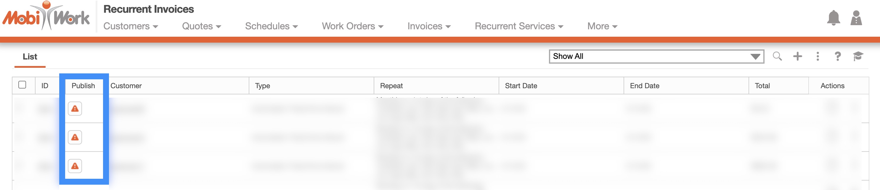 If there are recurrent invoices that have been updated but not published, a Caution Sign icon will appear next to the recurrent invoice: