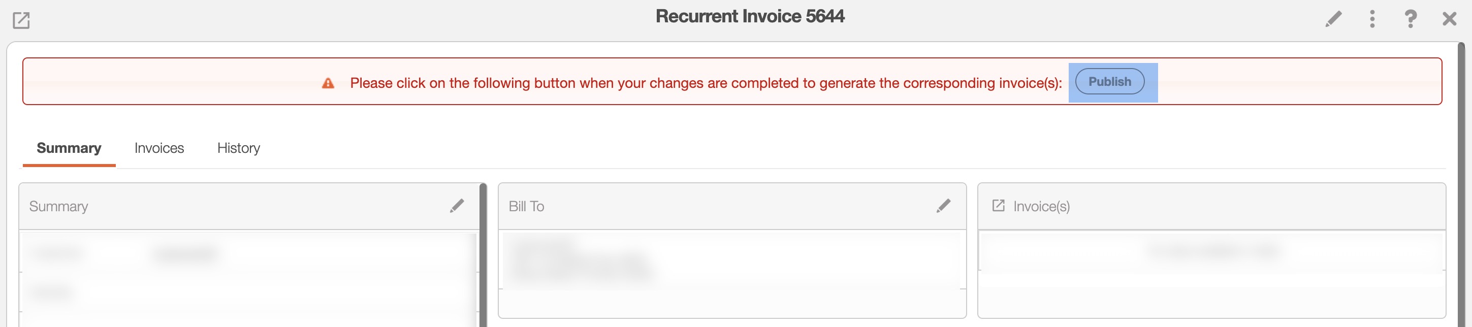 Any changes that are made to a recurrent invoice are not official until you publish the recurrent invoice.