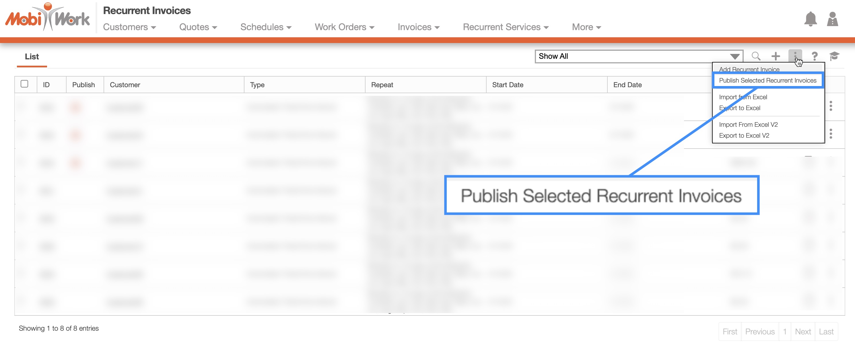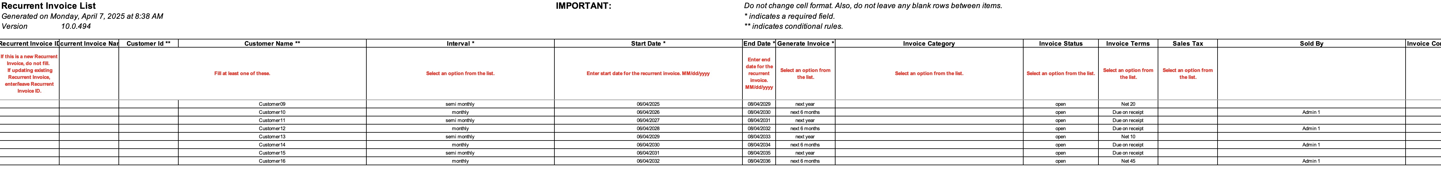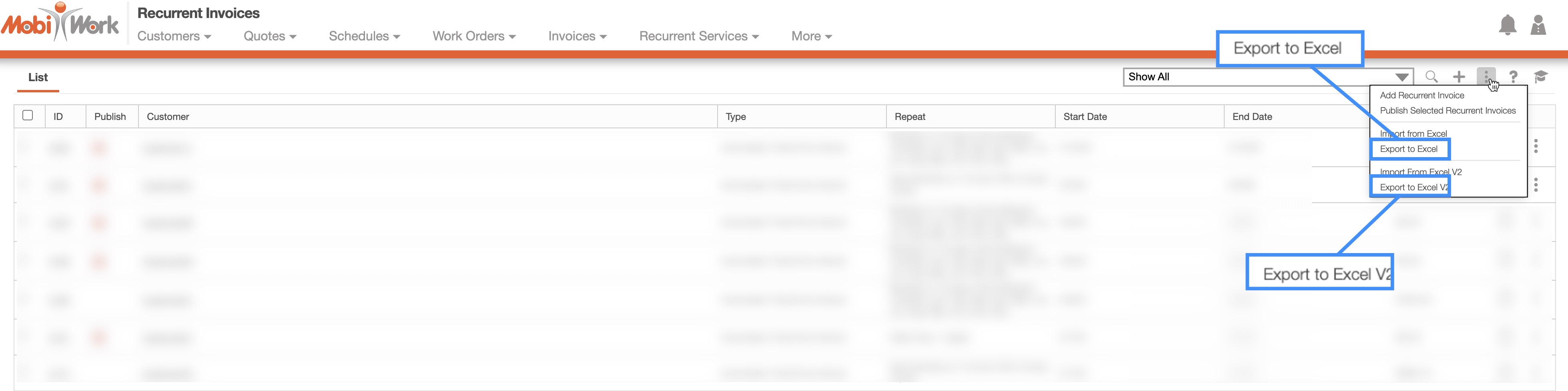 You can update multiple recurrent invoices by first exporting them to an Excel file. After making your changes, simply re-import the updated Excel document back into MobiWork to apply the updates. For more information on how to import and export Excel files, please see the Import and Export Recurrent Invoices page.