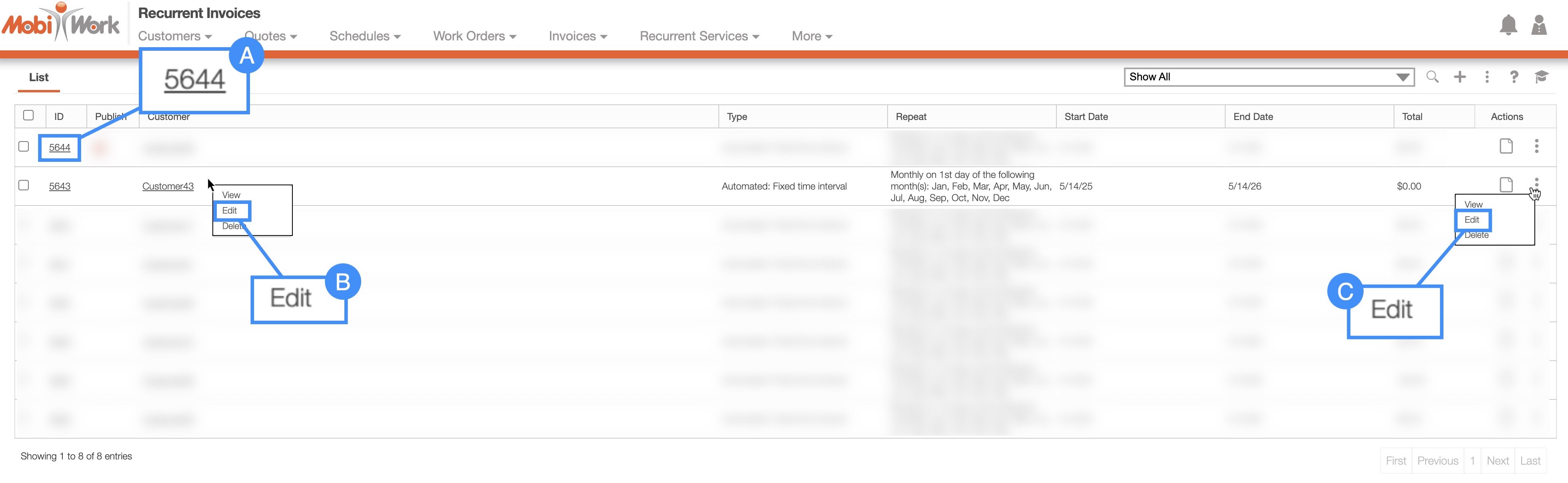 There are several ways you can edit a recurrent invoice within MobiWork. You can edit the recurrent invoice through the View Recurrent Invoice pop-up window, the View Recurrent Service pop-up window, and through the Recurrent Invoice feature page. The subsections listed below will highlight how to edit the overall recurrent invoice details.