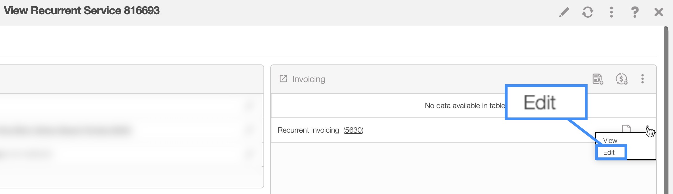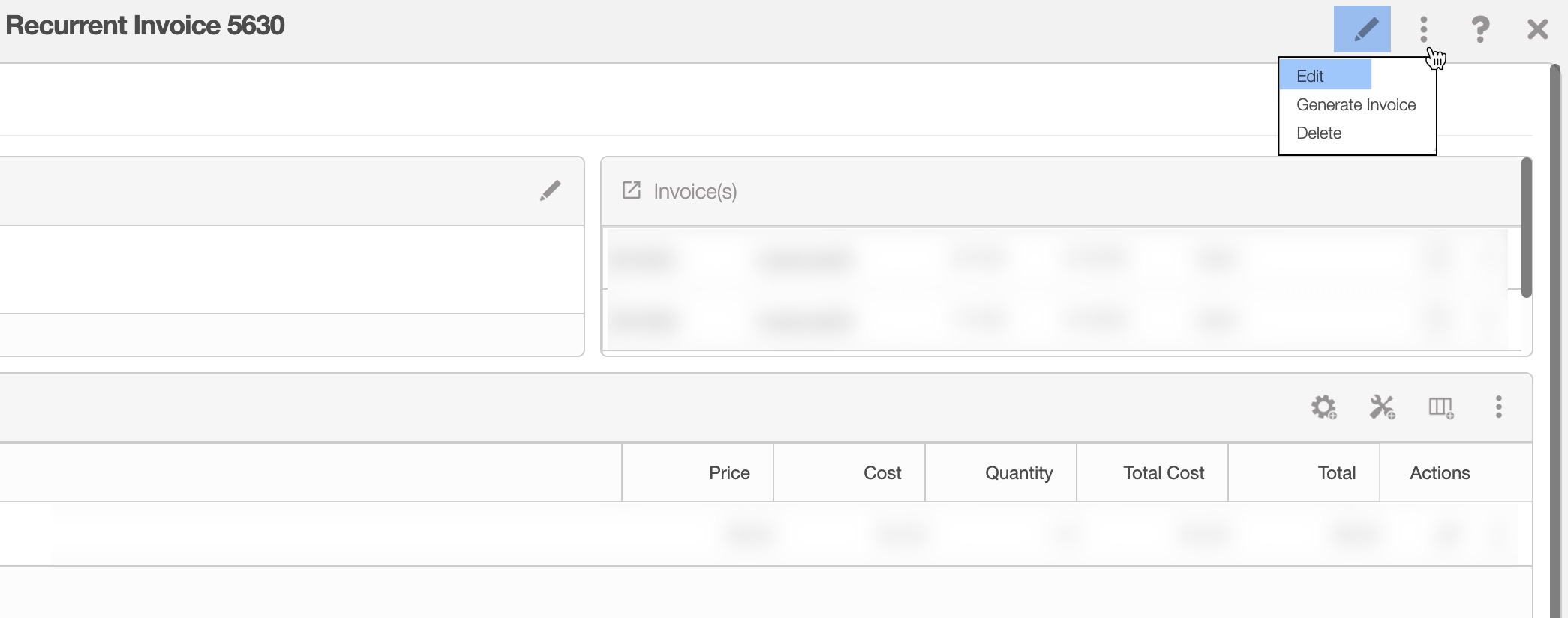 You can also edit a recurrent invoice from the View Recurrent Service pop-up window's "Invoicing" panel. Click on the Individual Actions button of the desired recurrent invoice, and from the drop-down select the "Edit" option: