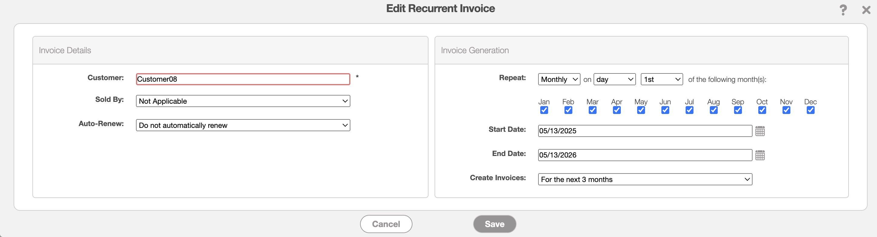As outlined in the How to Access the Page subsection above, there are several different ways you can access the Edit Recurrent Invoice pop-up window. This pop-up window allows you to modify the terms of the recurrent invoice. Once the Edit Recurrent Invoice pop-up window appears, update the fields that you would like to change for the selected recurrent invoice.