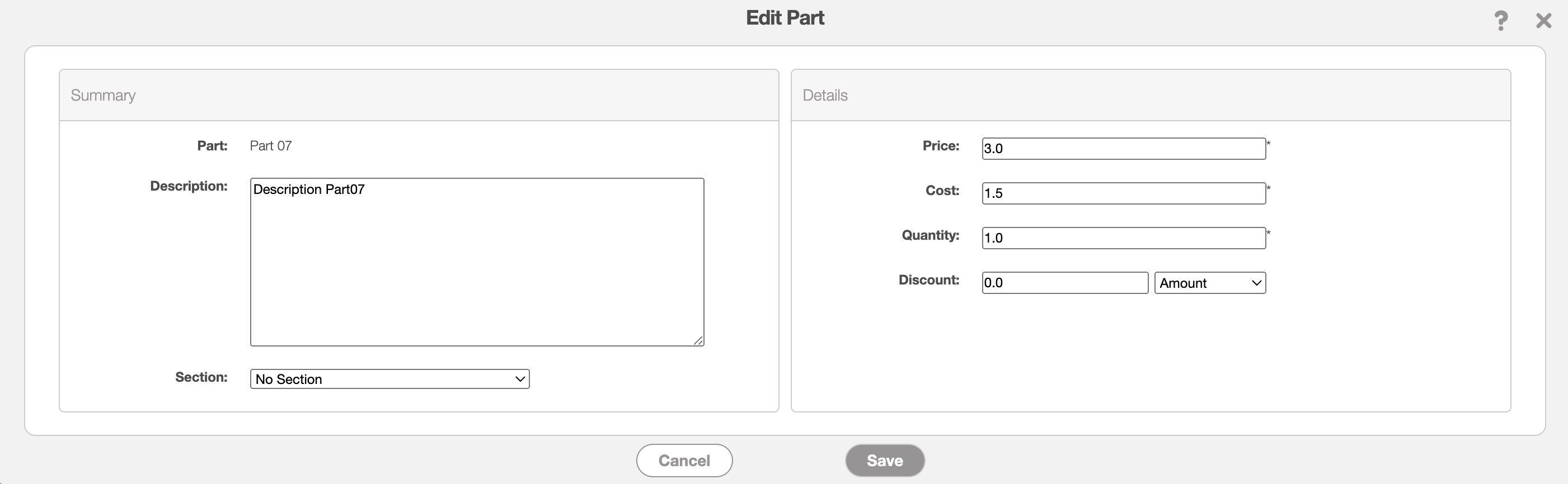 Once you click on the "Edit" option or the Pencil icon, the Edit Part pop-up window will appear: