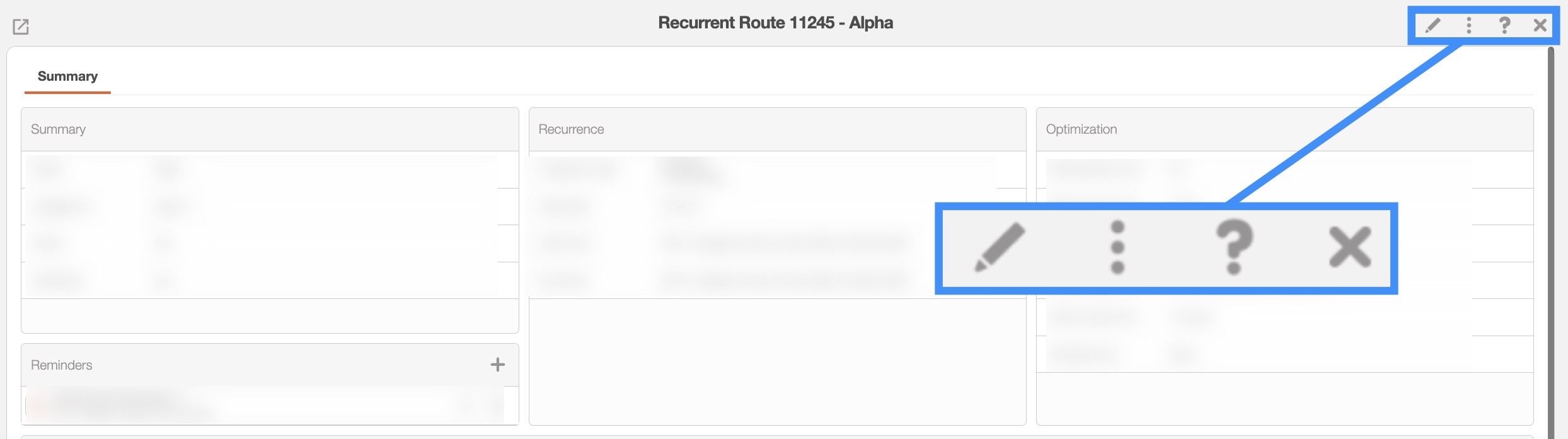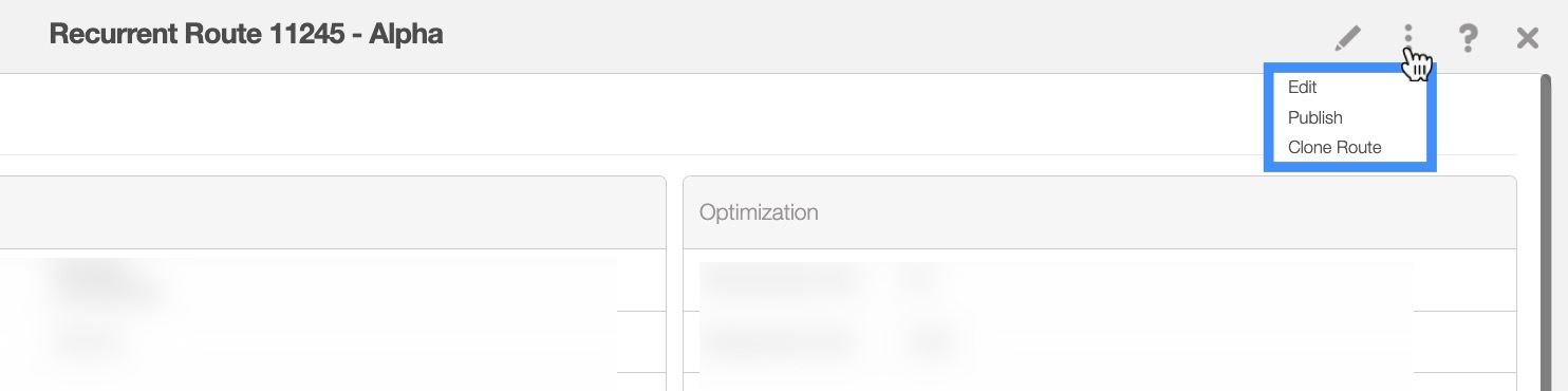 The recurrent route's upper right corner actions can be found in the top-right corner of the View Recurrent Route pop-up window: