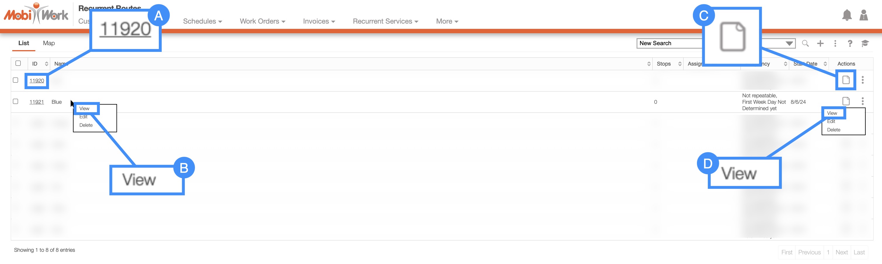 There are several different ways you can access the View Recurrent Route pop-up window in MobiWork.