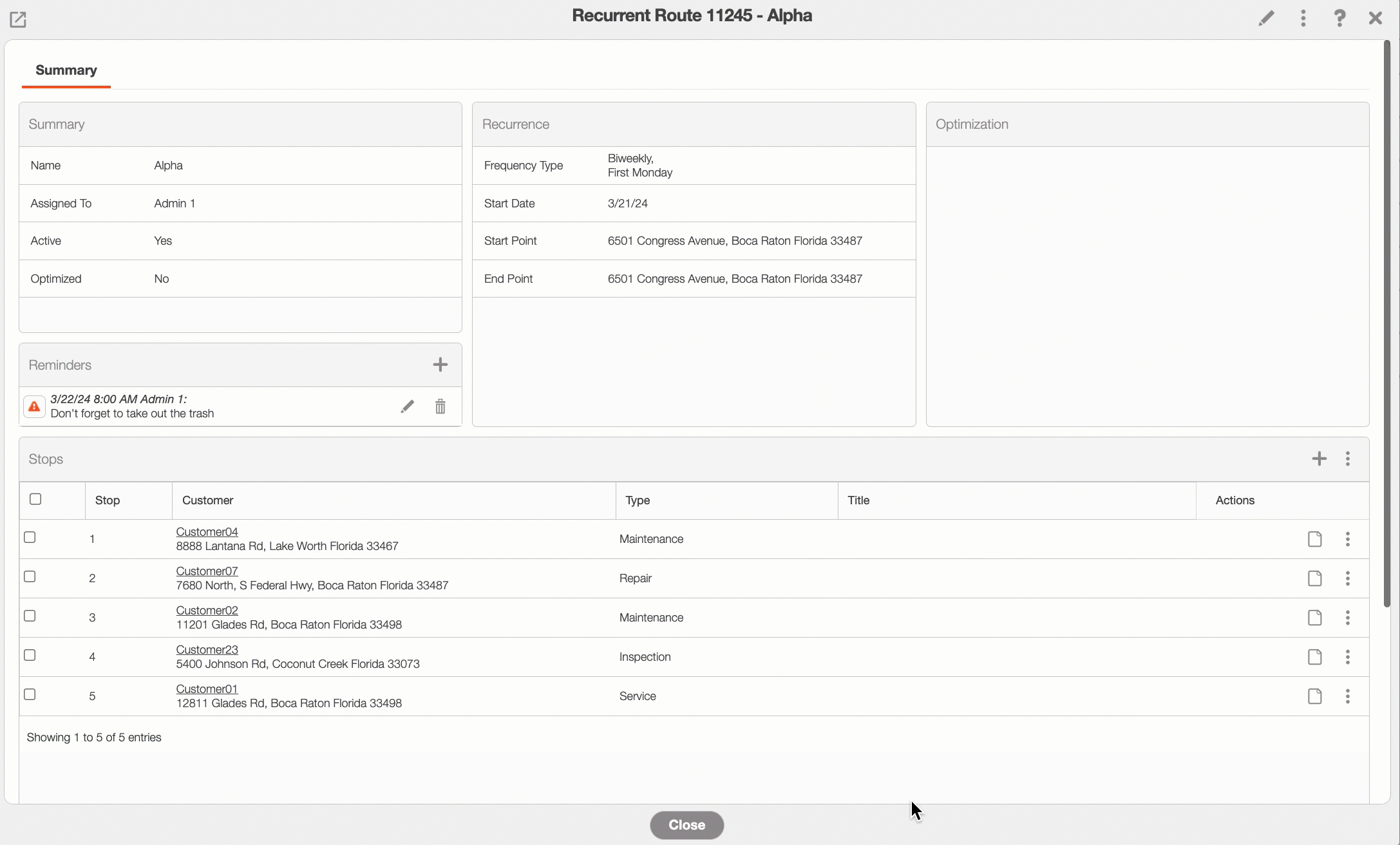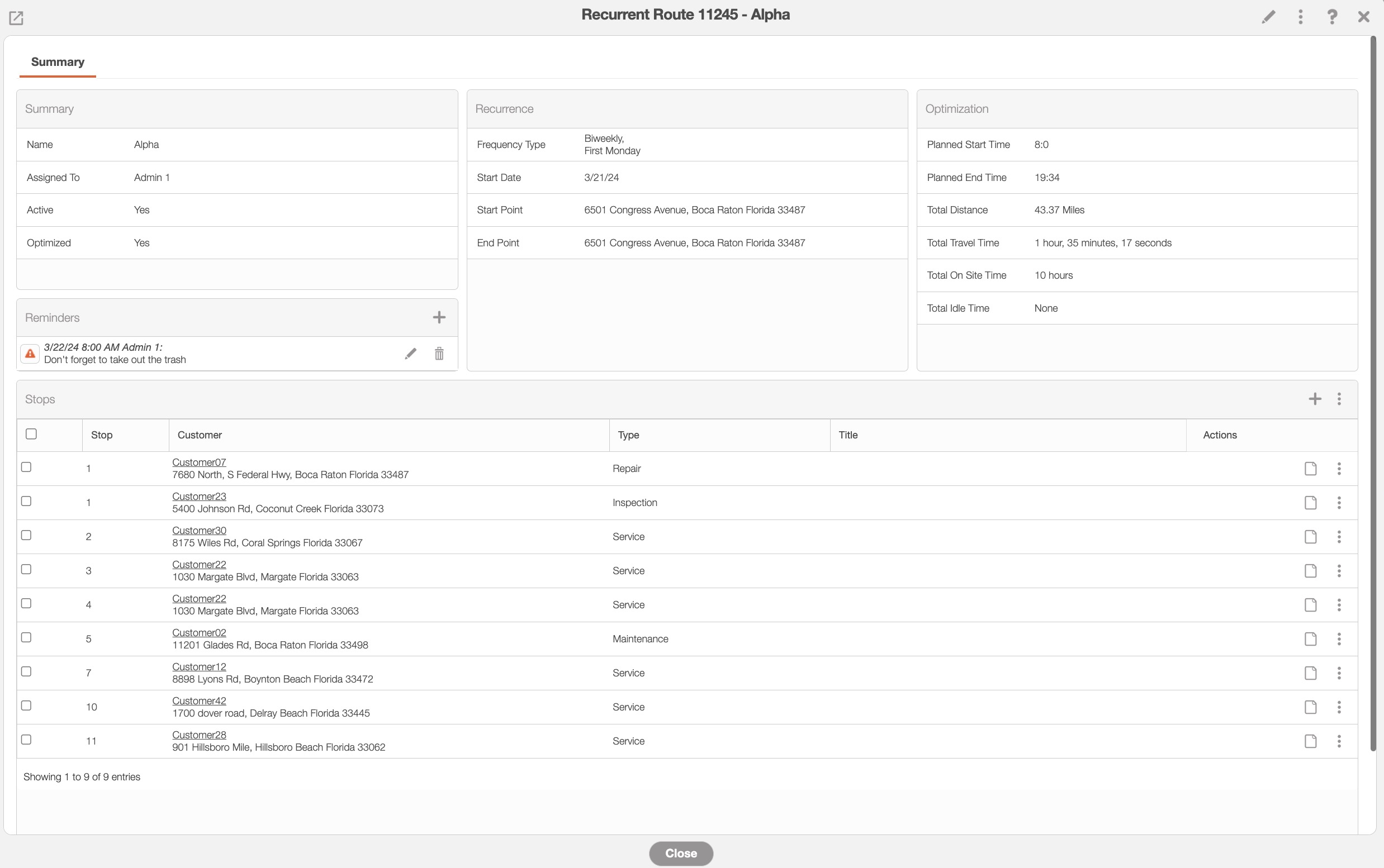 On this pop-up window, you will be able to view the user assigned to the route, all the stops associated with the route, reminders, and more. You will also be able to utilize the functions listed below: