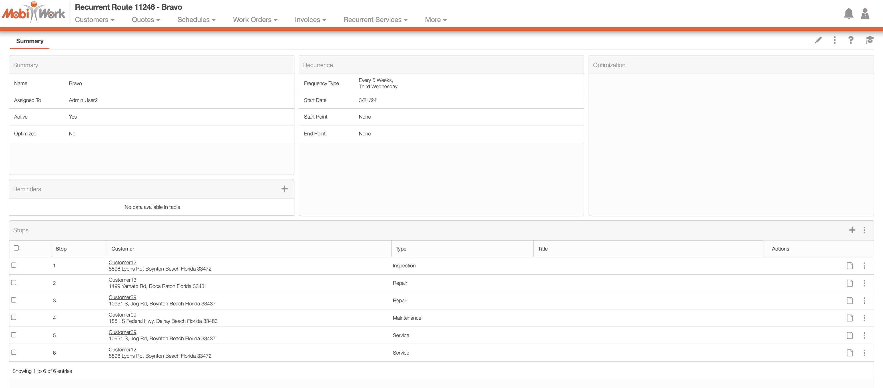 The More Actions button will allow you to optimize the route, add the stops to another user's route, delete multiple stops, and show the entire recurrent route on a map.