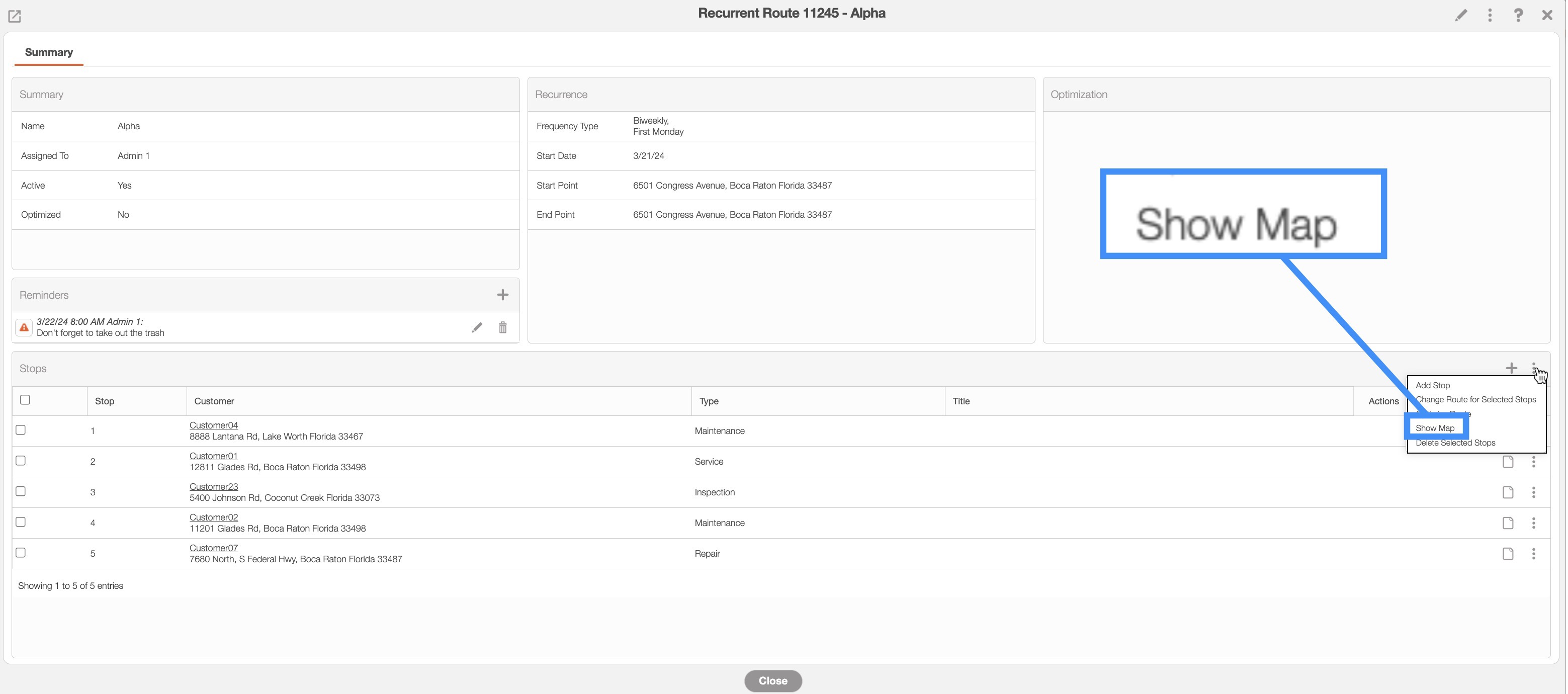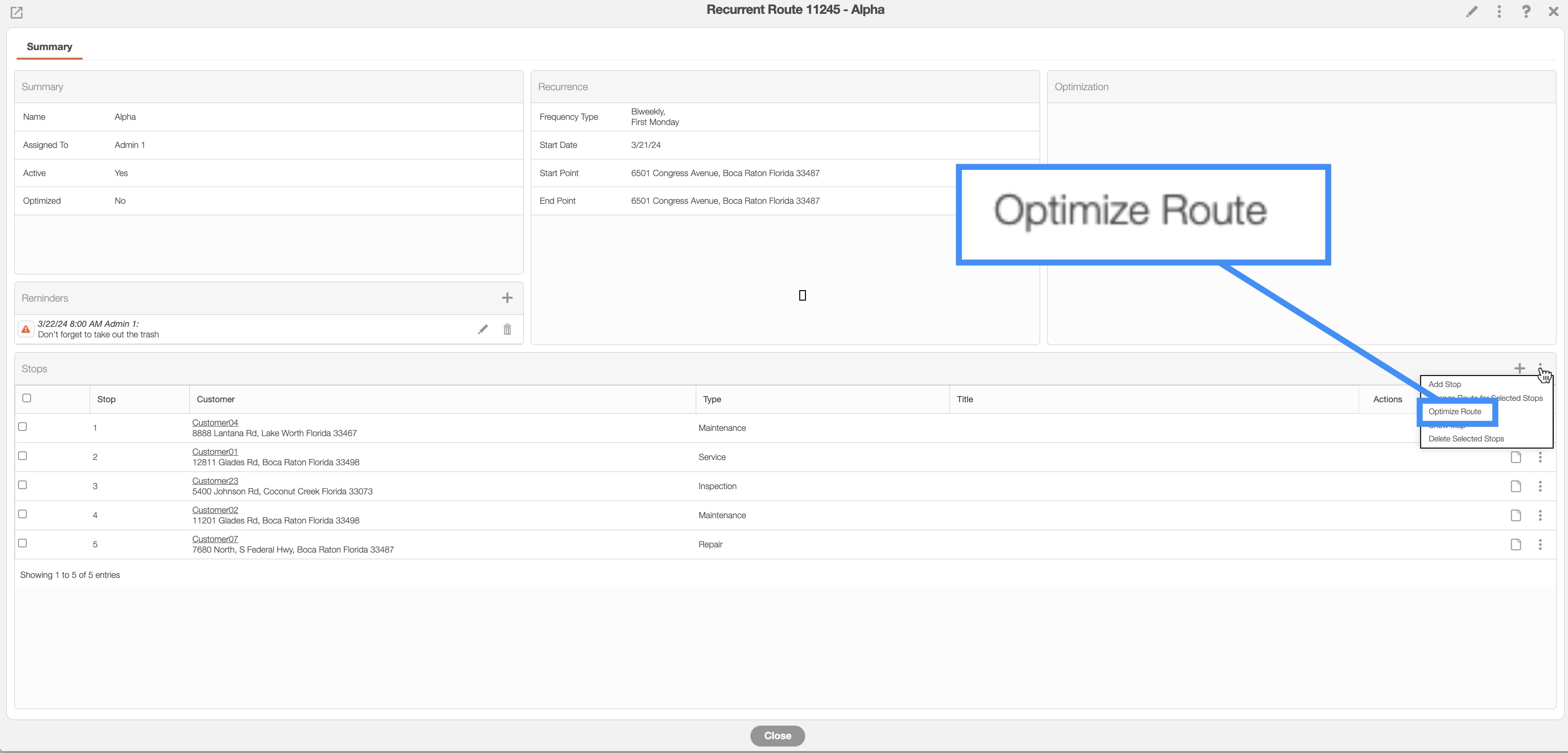 To optimize your recurrent route, you will first need to open the View Recurrent Route pop-up window. For more information on how to access this pop-up window, please see View Recurrent Route page.