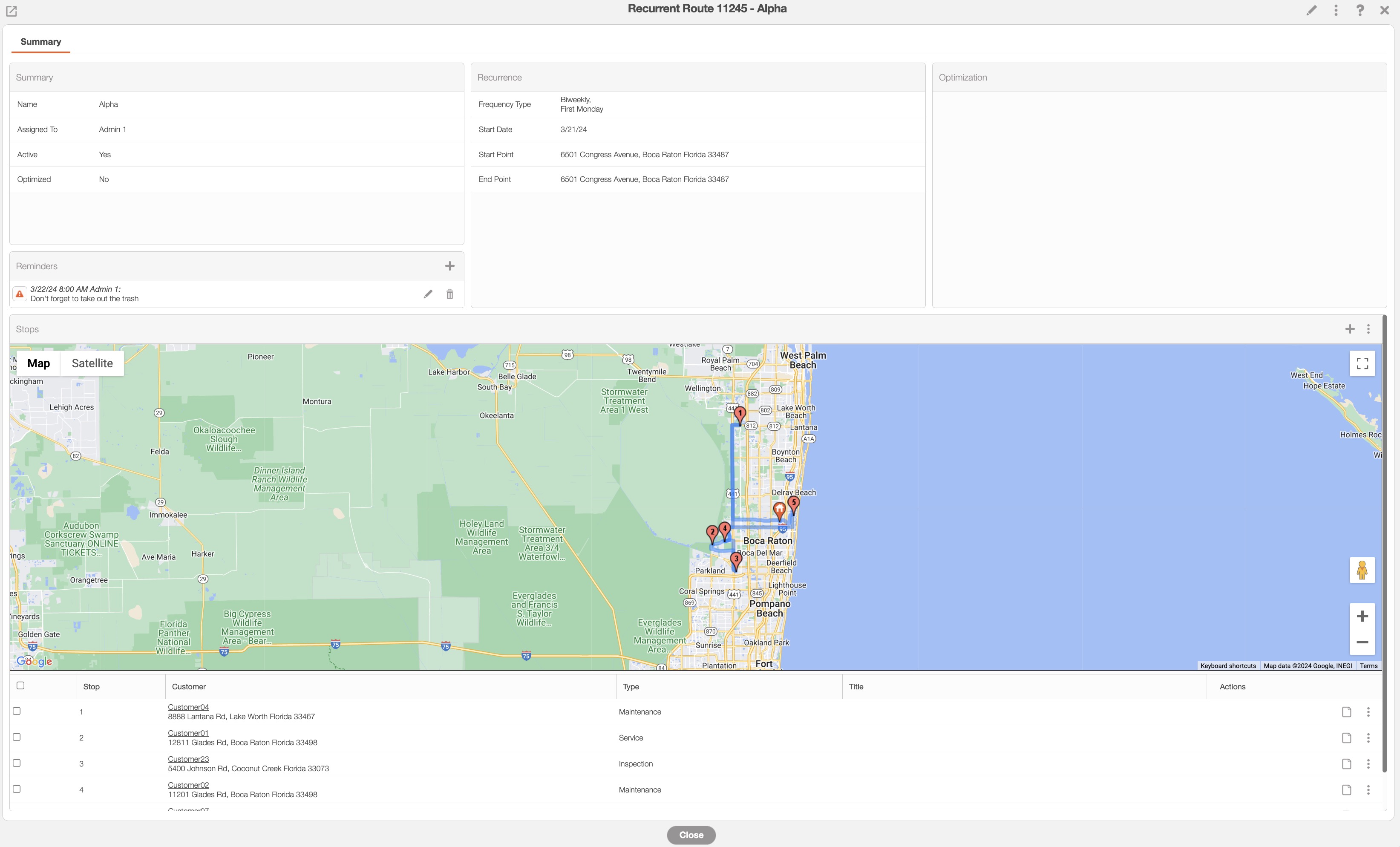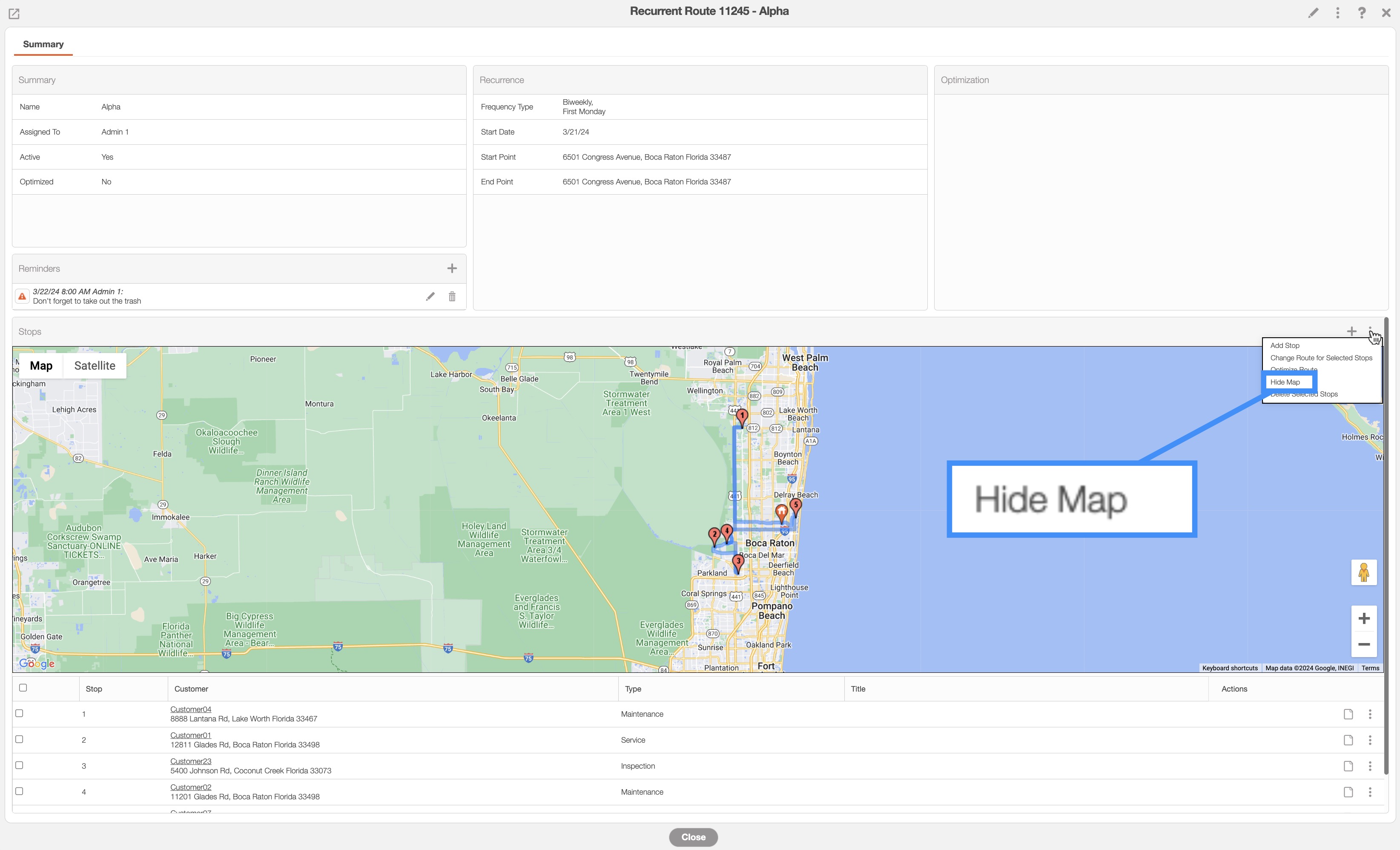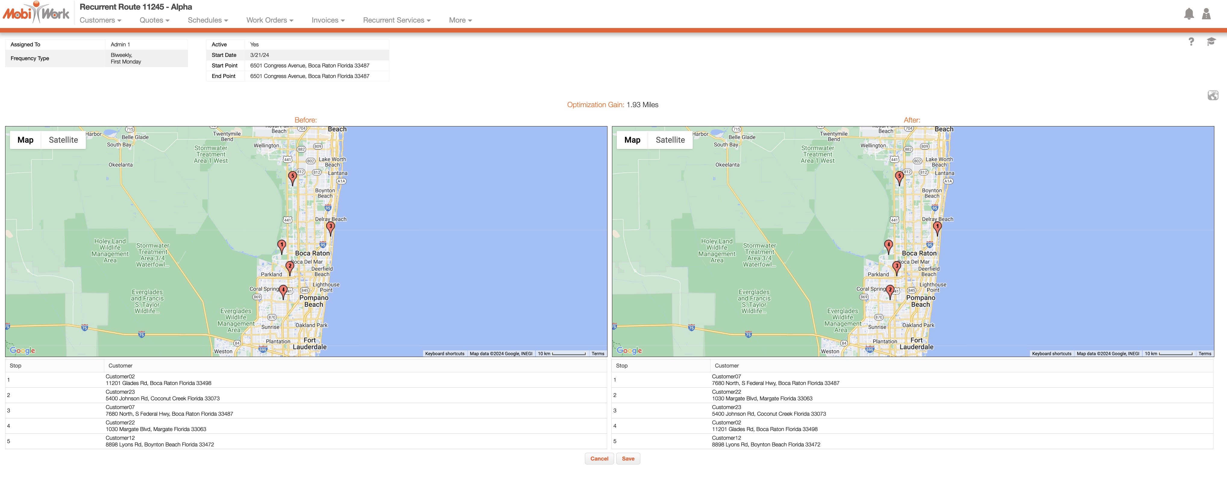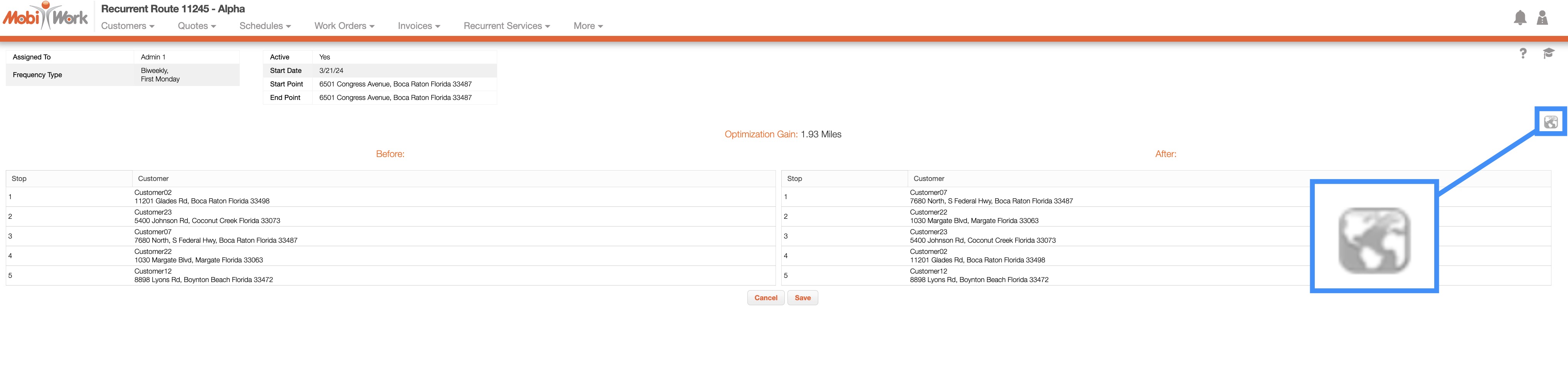 The "Before" and "After" route updates will be shown, as well as, the miles gained after optimization. By clicking the Map button, you will be able to visually view the order of the recurrent route stops on a map: