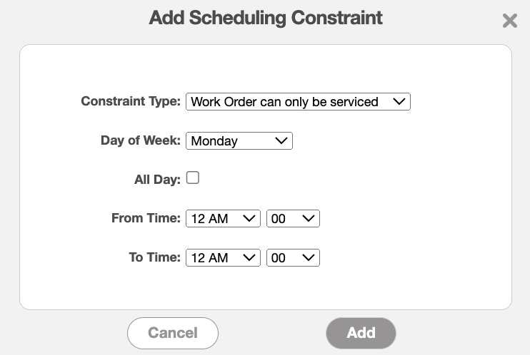 The "Constraint Type." This drop-down will specify whether the work order can only be serviced at certain times, cannot be serviced at certain times, or must be the first stop.