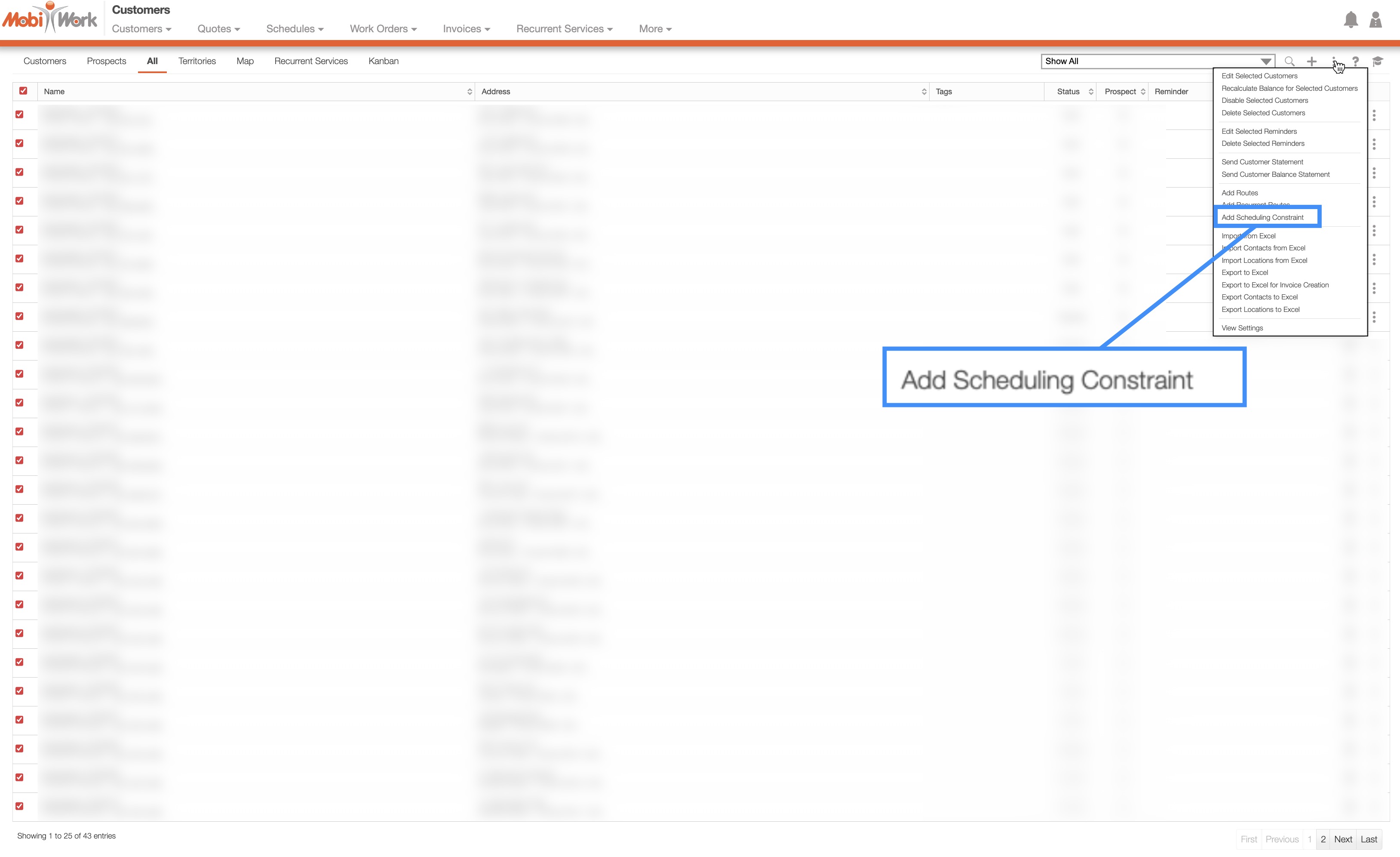 Select the desired customers where you would like to add a constraint, then select the "Add Scheduling Constraints" option from the More Actions drop-down menu: