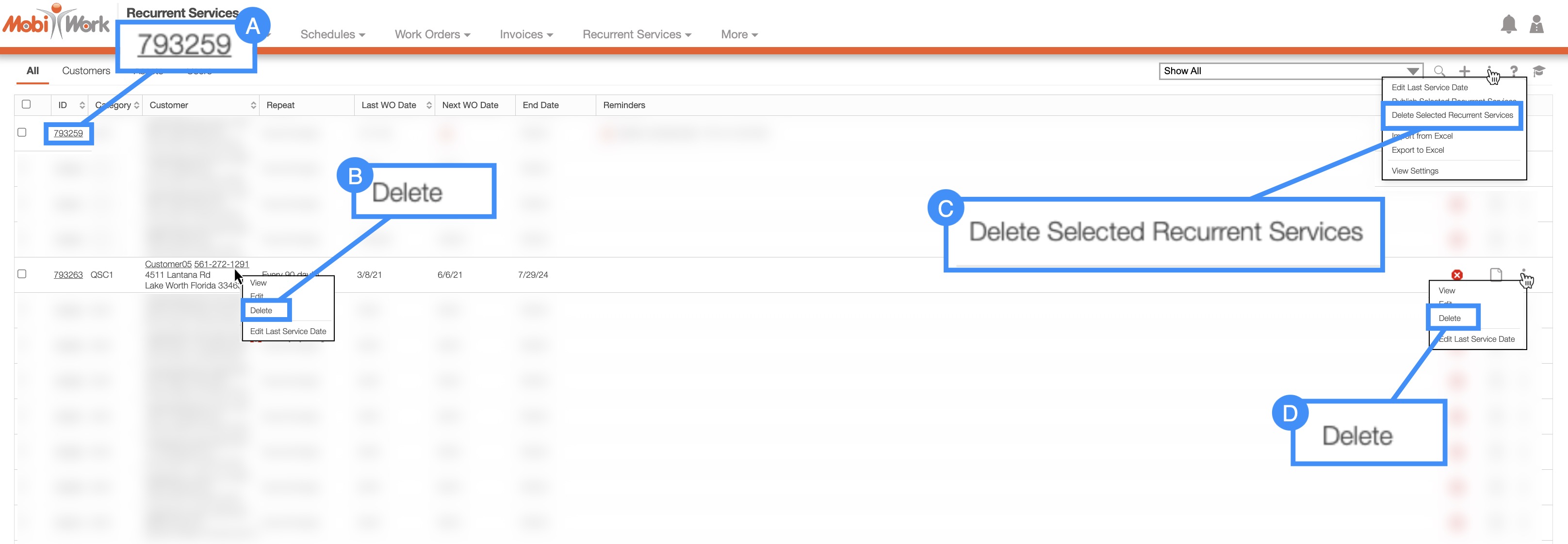 MobiWork allows you to delete multiple recurrent services at once, thus saving you time and energy from having to delete recurrent services one at a time.