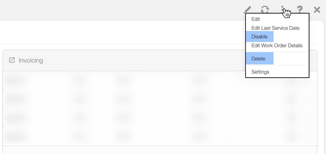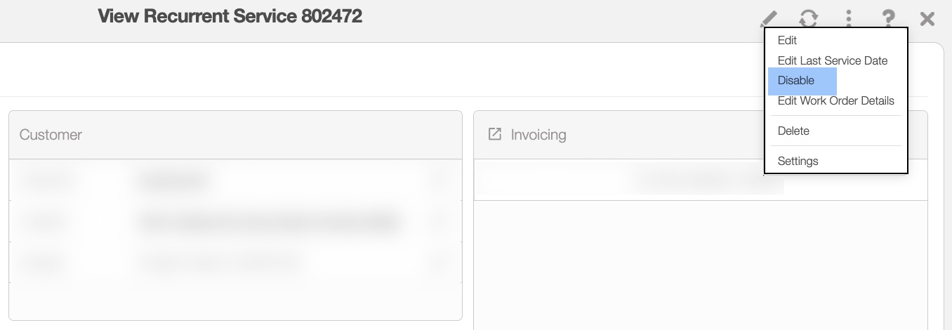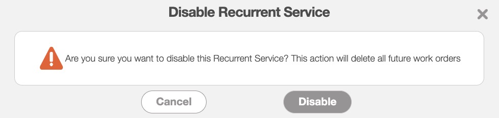 When a recurrent service is disabled, completed past and future work orders will remain untouched, as well as any incomplete work orders scheduled in the past. Any associated recurrent invoices will be disabled, but any standard invoices linked to the service will remain unchanged.