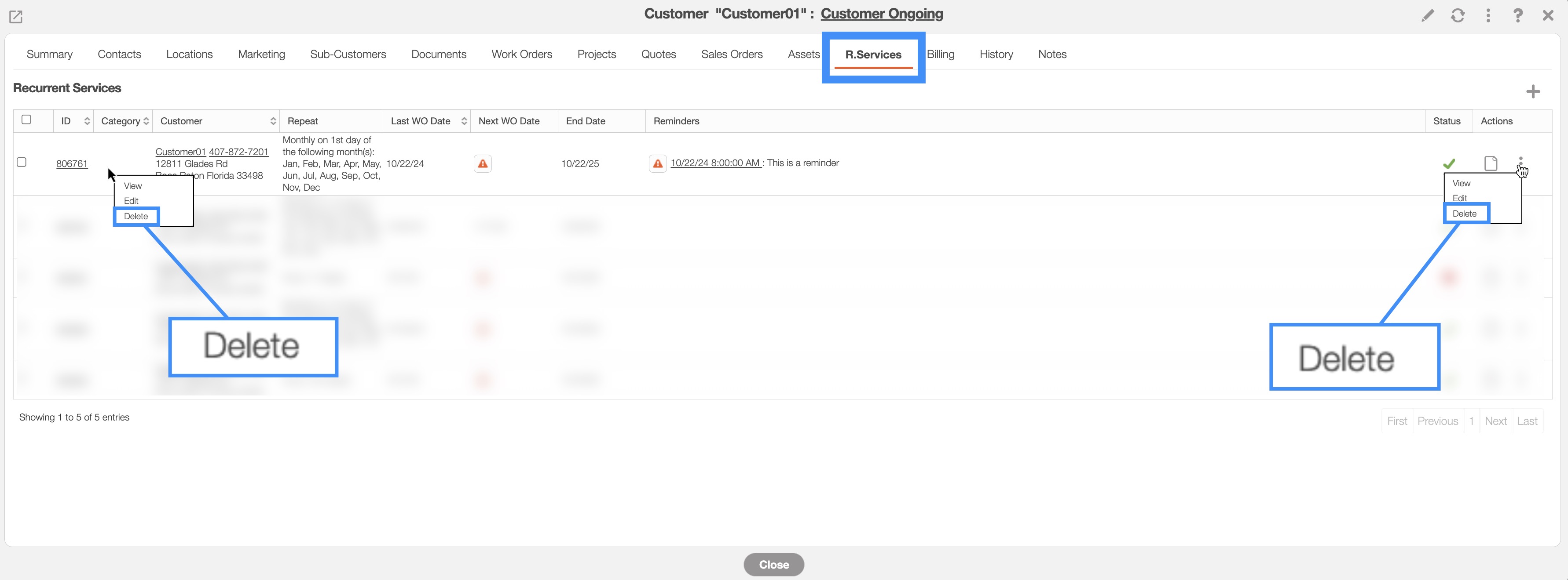 Once you open the View Customer pop-up window select the "R. Services" tab, and select the "Delete" option from the Individual Actions drop-down: