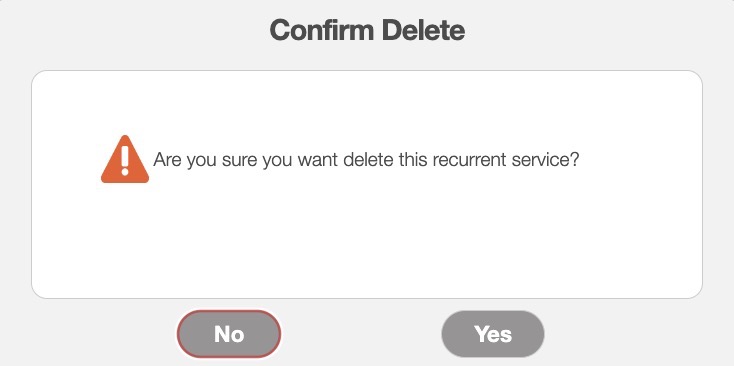 Regardless of how you choose to delete a recurrent service, a warning pop-up will appear asking to confirm if you would like to delete this recurrent service, and informing you that the deletion of a recurrent service is permanent:
