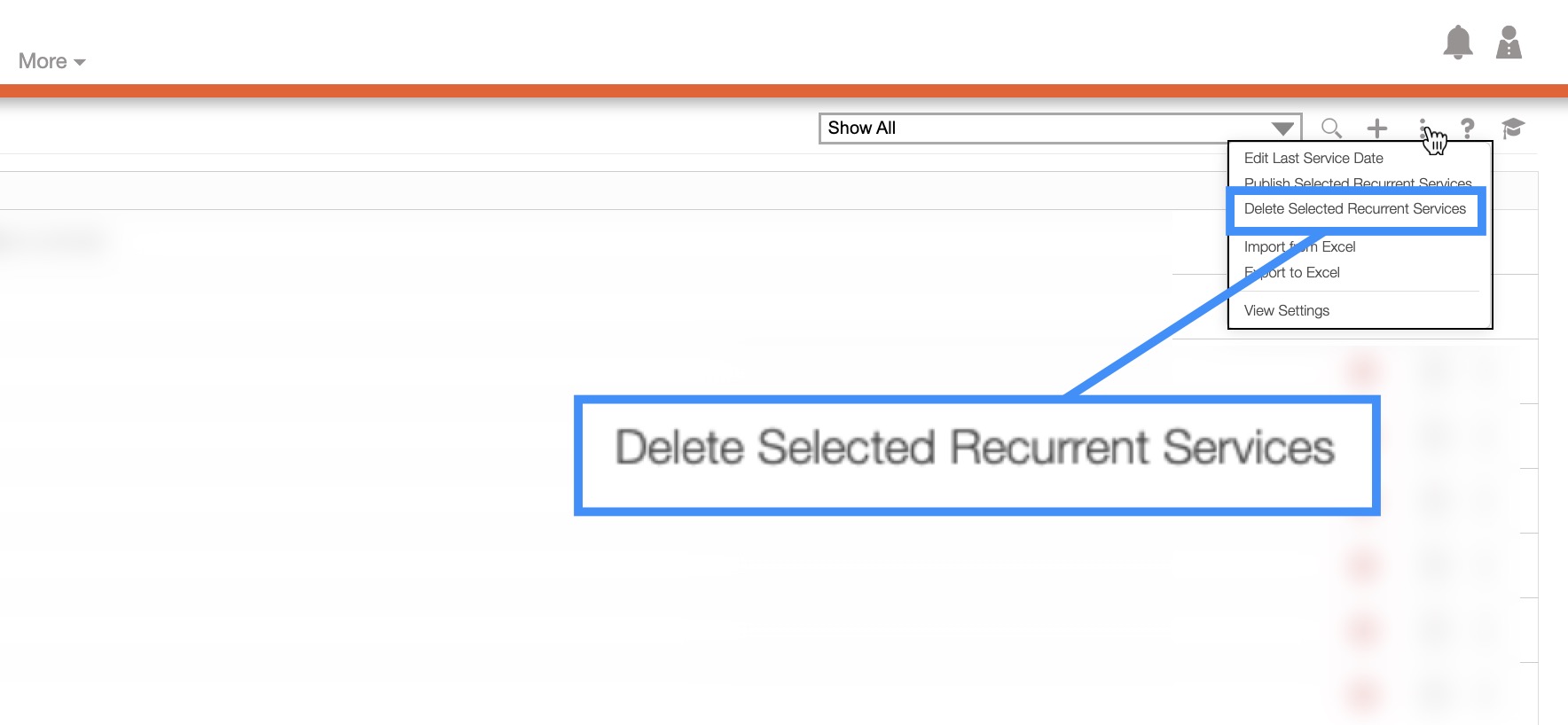 To delete multiple recurrent services, you will need to access the More Actions button from the Recurrent Services feature page: