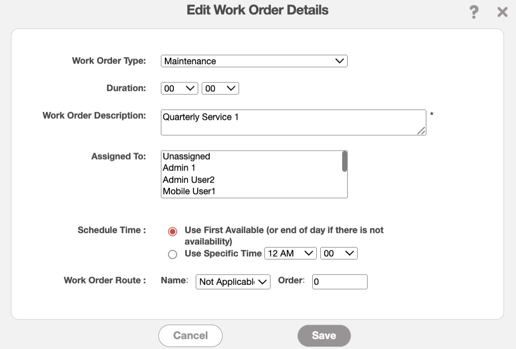 | "Schedule Time" | The time that the work order is scheduled to begin. You can also select first availability. |