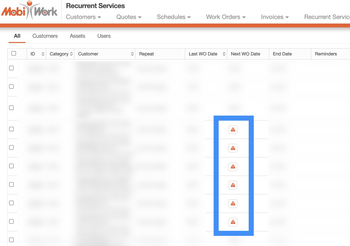 If there are recurrent services that have been updated but not published, a Caution Sign icon will appear next to the recurrent service: