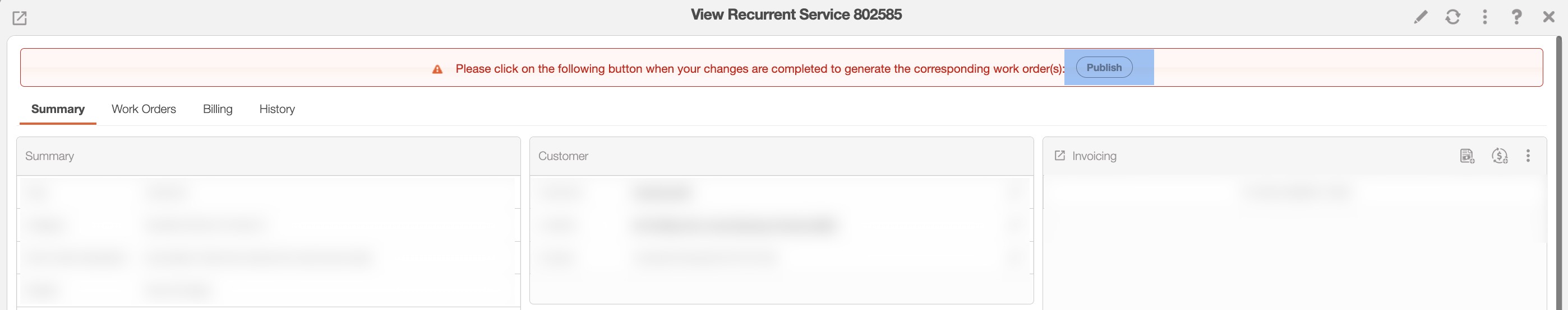Important: Once you edit and publish a recurrent service, the recurrent service and the corresponding future work orders will be updated. Past work orders and completed and onsite future work orders will remain the same.