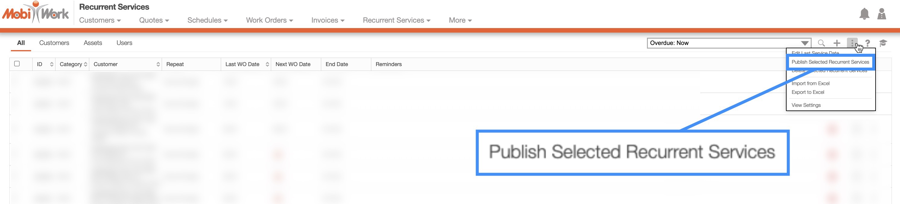 You can publish multiple recurrent services at once from the Recurrent Service List page, by clicking on the More Actions button and selecting the "Publish Selected Recurrent Services" option from the drop-down: