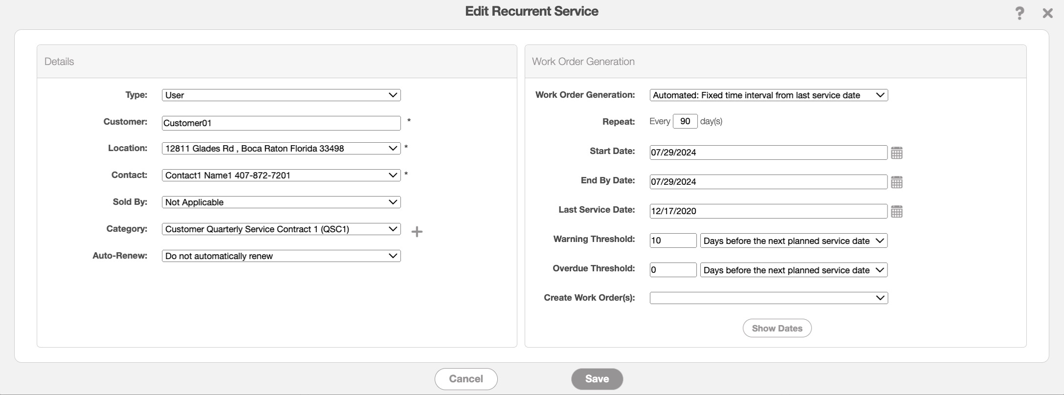 For more information on how work orders are automatically generated from a recurrent service, please see the Recurrent Services Work Orders page.