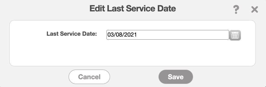 As outlined in the How to Access the Page subsection above, there are several different ways you can access the Edit Last Service Date pop-up window. Regardless of the method you choose, the Edit Last Service Date pop-up window will appear. Enter the new date and once you are satisfied, click the Save button: