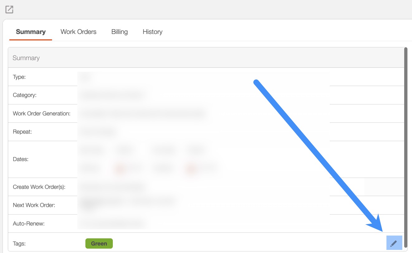 To add a new tag to your recurrent service, open the View Recurrent Service pop-up window and in the "Summary" panel click on the Plus Sign button for the "Tags" column; if you have already added tags to your recurrent service, this icon will turn into a Pencil icon: