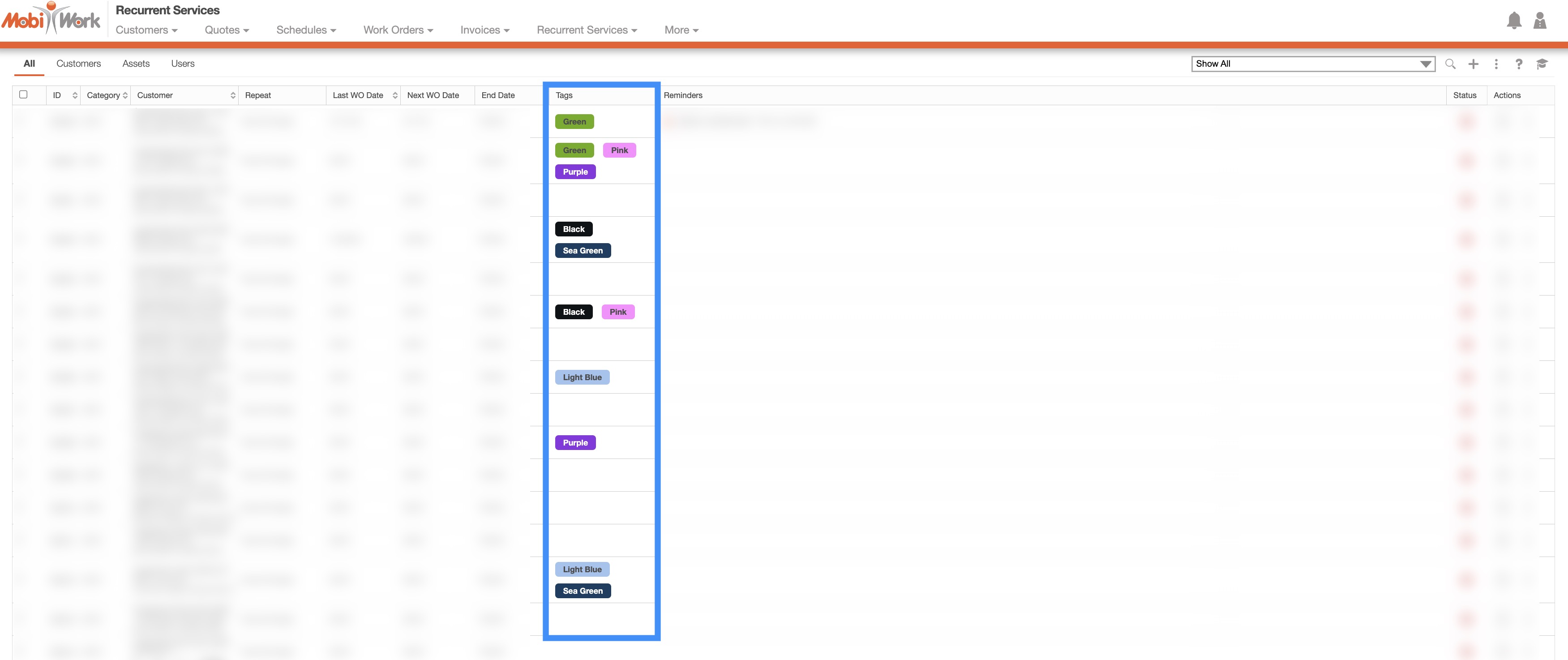 Tags serve as a visual indicator of custom statuses or categories, greatly enhancing organizational clarity by enabling you to identify designated recurrent services at a glance. These labels are highly adaptable, making it possible to tailor them to your business's unique requirements; this flexibility means that tags can represent a wide spectrum of information.