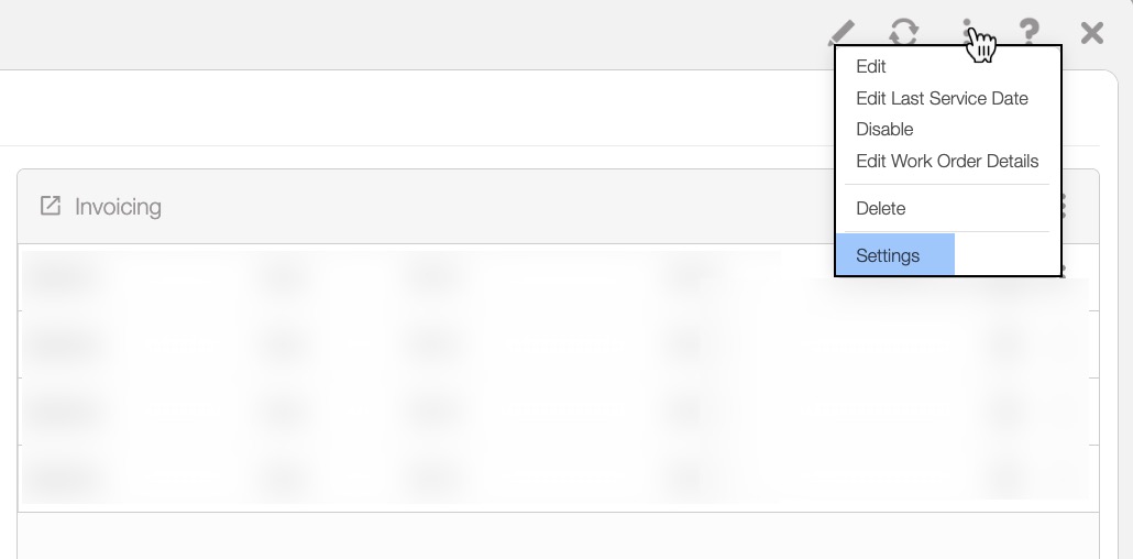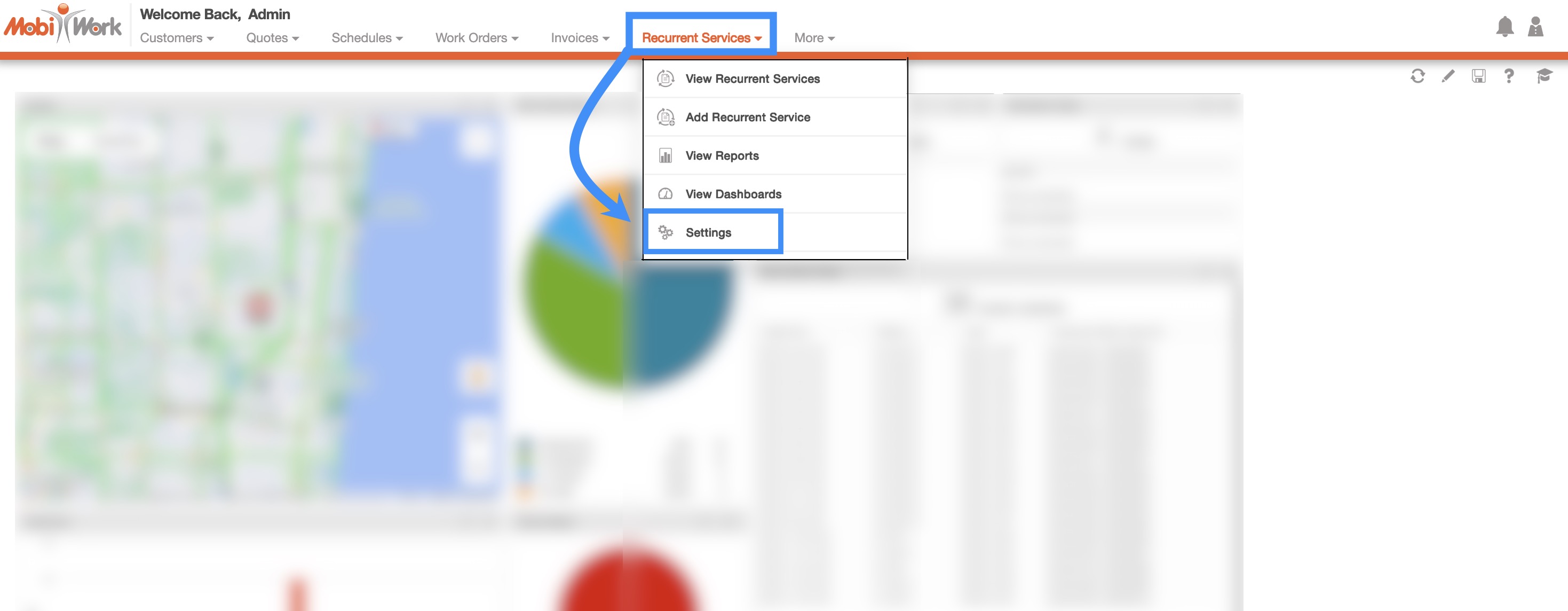 You can directly access the Recurrent Services Settings page by hovering over the Recurrent Services feature from your MobiWork menu, and clicking on the "Settings" option: