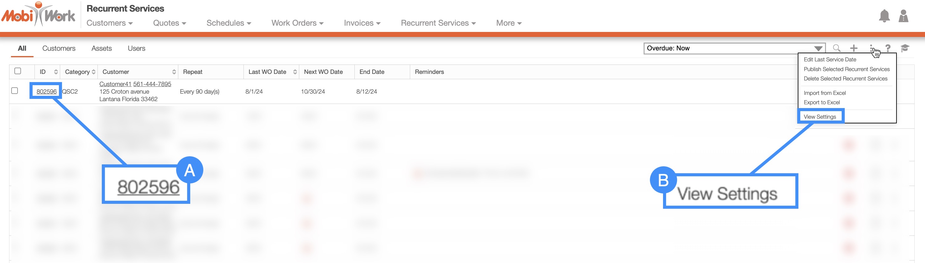 - Select the desired Recurrent Service ID and once the View Recurrent Service pop-up window appears, click on the Individual Actions button. From the drop-down choose the "Settings" option: