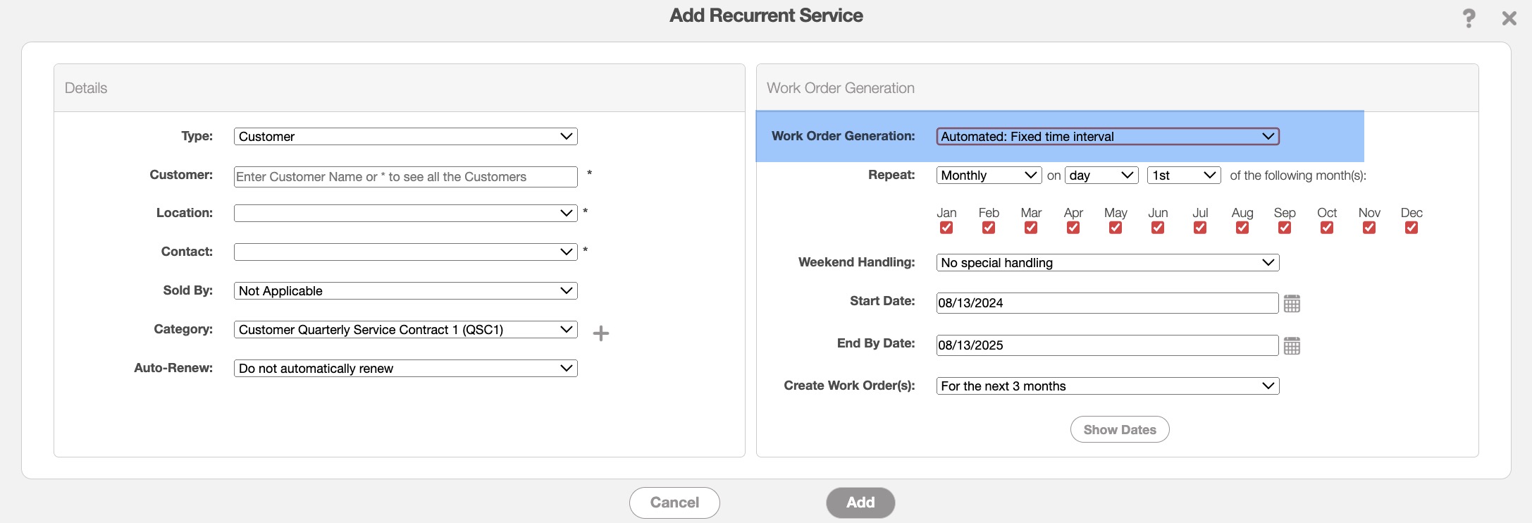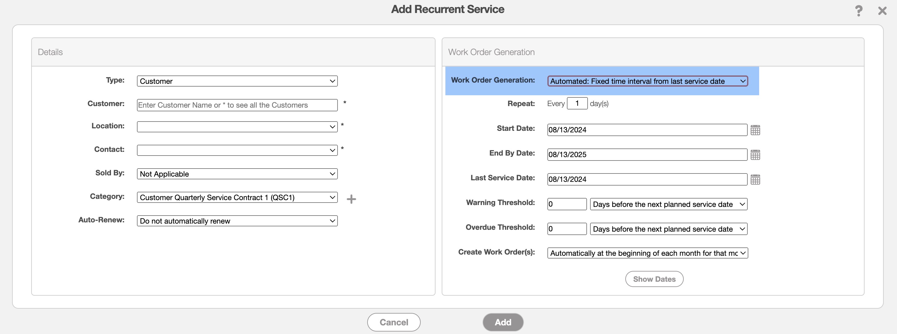 The "Automated: Fixed Time Interval From Last Service Date" option allows you to automatically generate work orders based on the last service date: