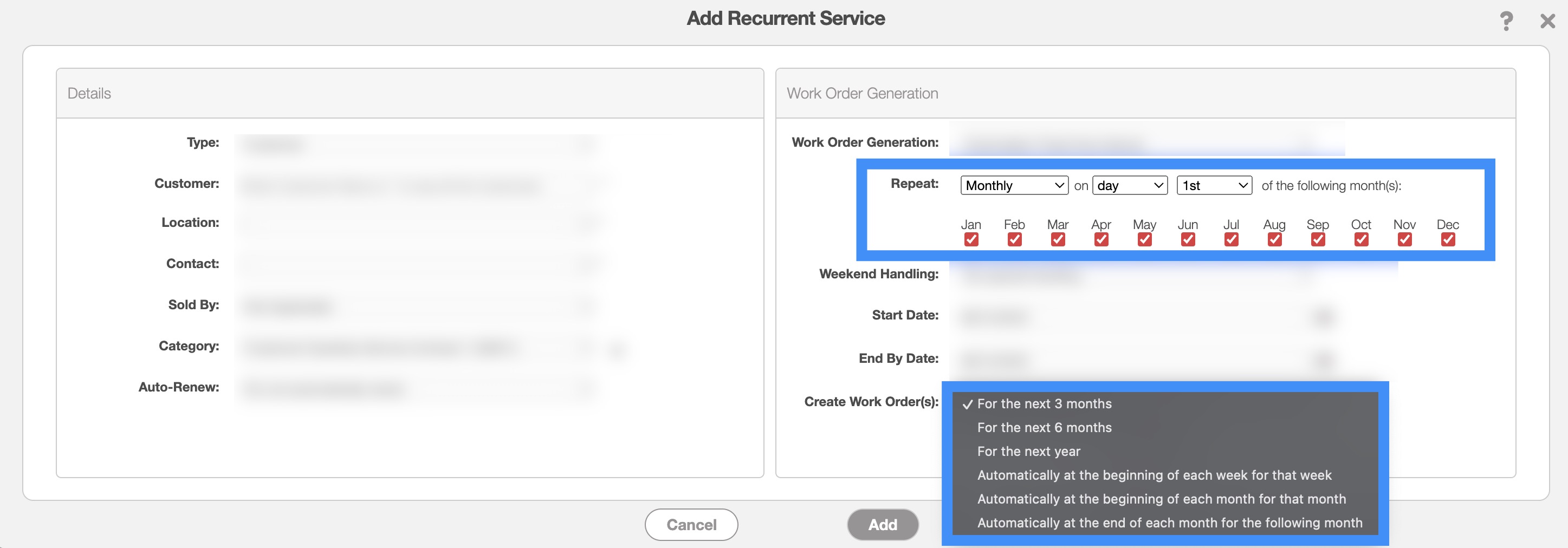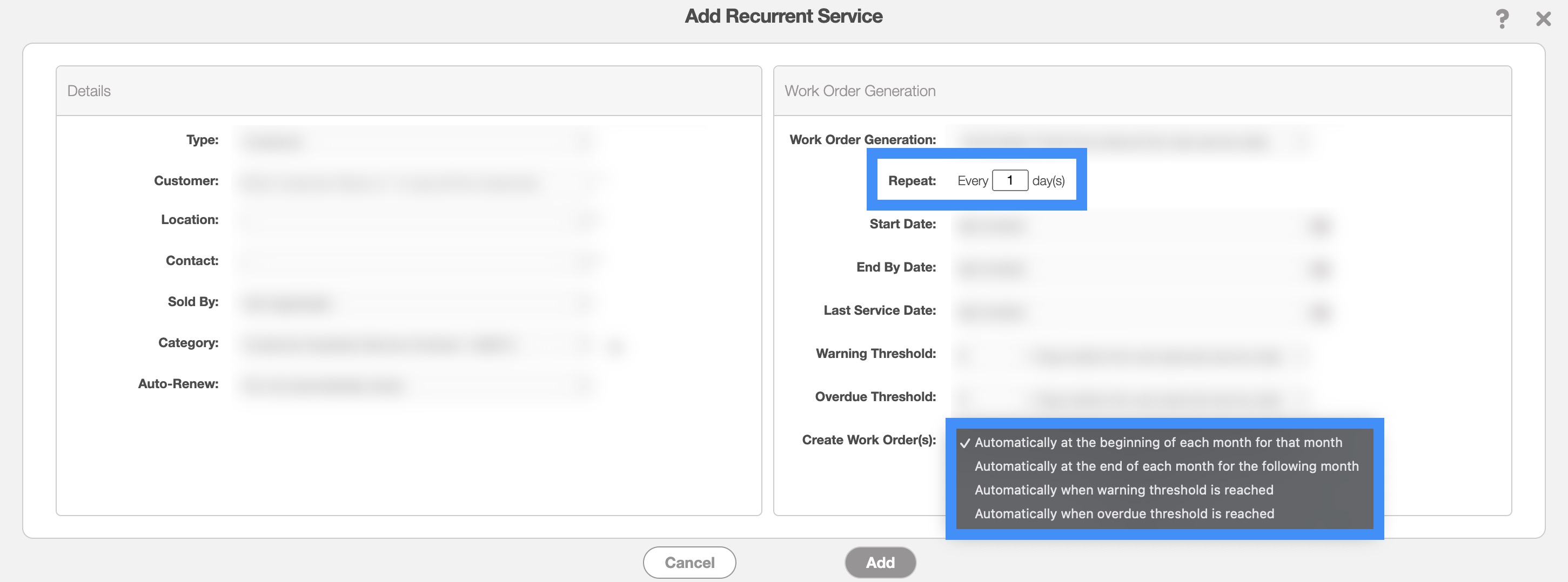 In the "Create Work Order(s)" field, you can set how frequently work orders are generated according to the recurrence schedule specified in the "Repeat" field: