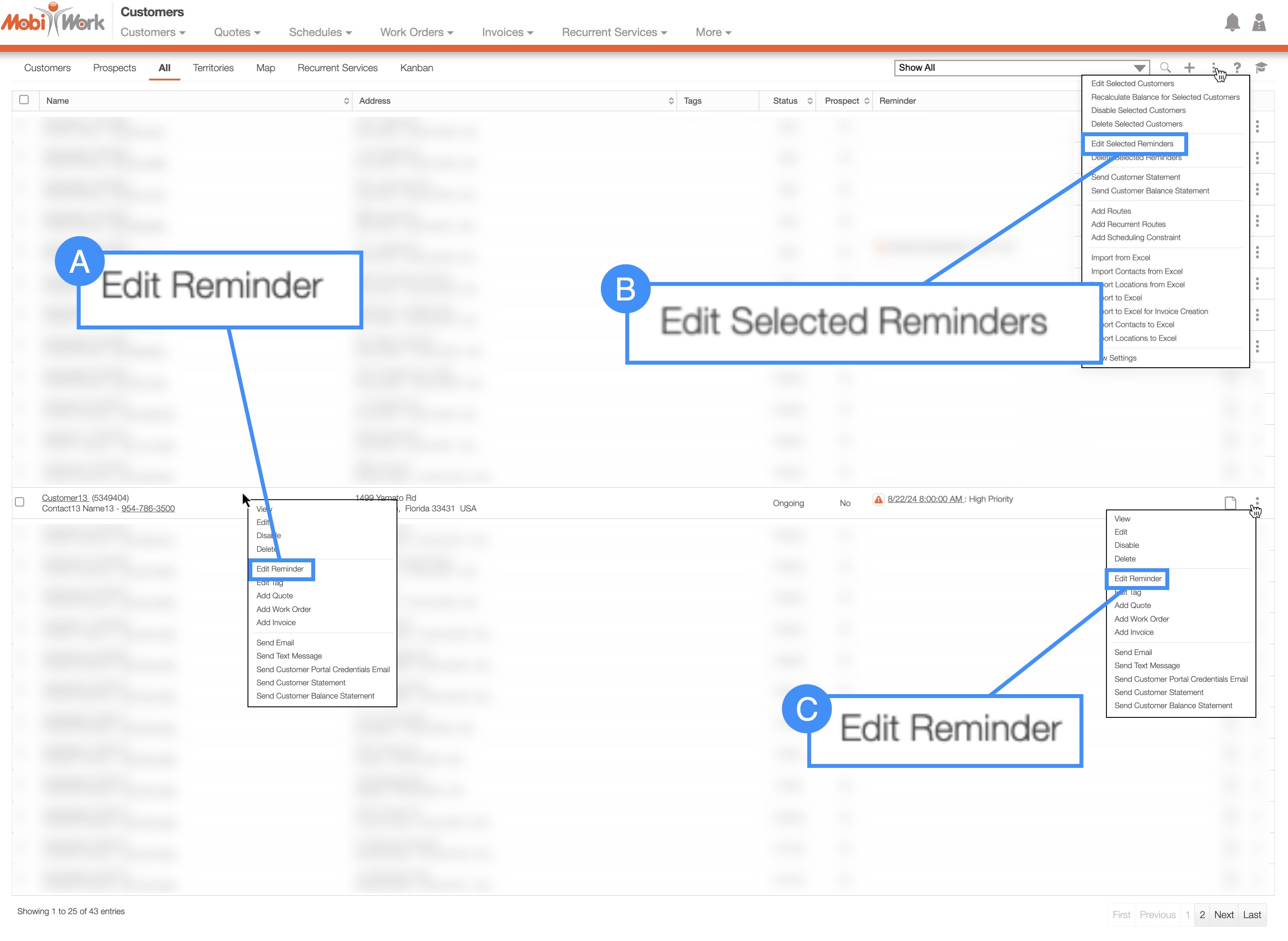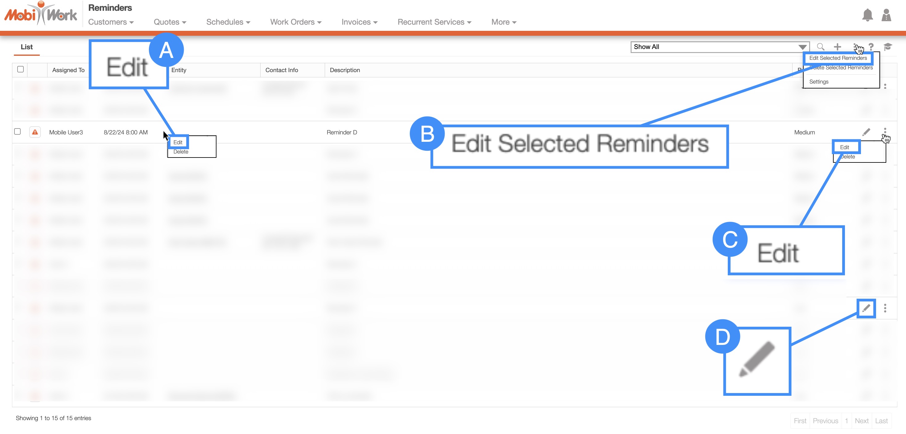 There are many different ways you can edit reminders in MobiWork; reminders can be edited from the Reminders "List" tab or the Customers "List" tab. Additionally, whenever you access the view pop-up window of a selected entity, you can edit the associated reminder for a user. For example, you can edit a reminder from the View Work Order pop-up window or the View Quote pop-up window. The following subsections will highlight how to edit reminders in MobiWork.