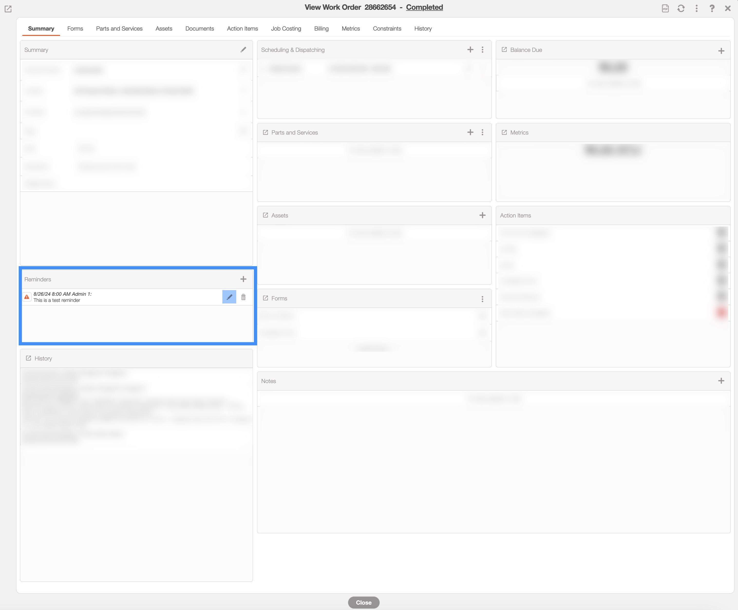 The example below shows how to edit a reminder in the View Work Order pop-up window, however, the process is the same in any of MobiWork's entity's view pop-up windows: