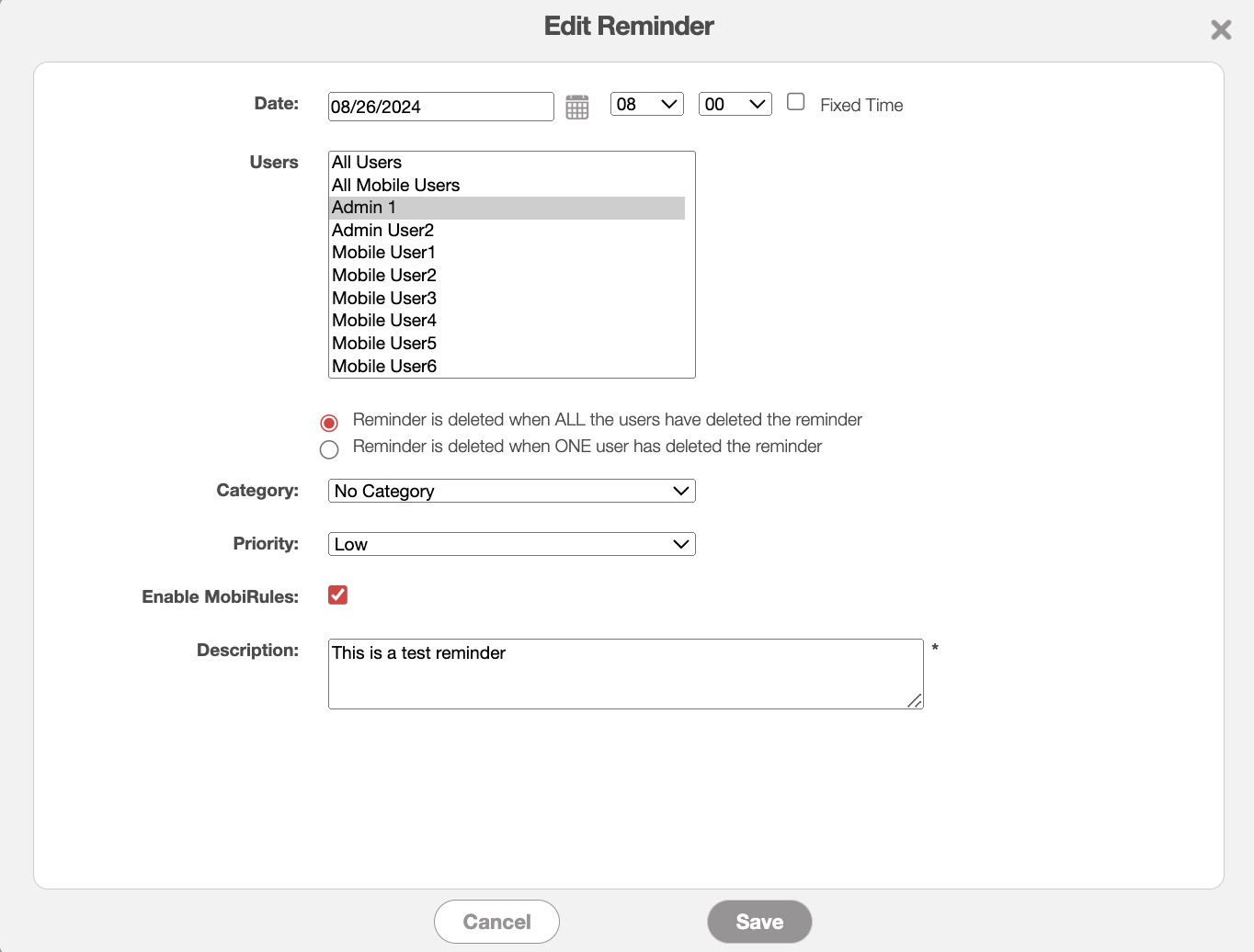 | "Enable MobiRules" | Allows you to choose whether to enable MobiRules with the reminder. Please Contact Us for additional information regarding MobiRules. |