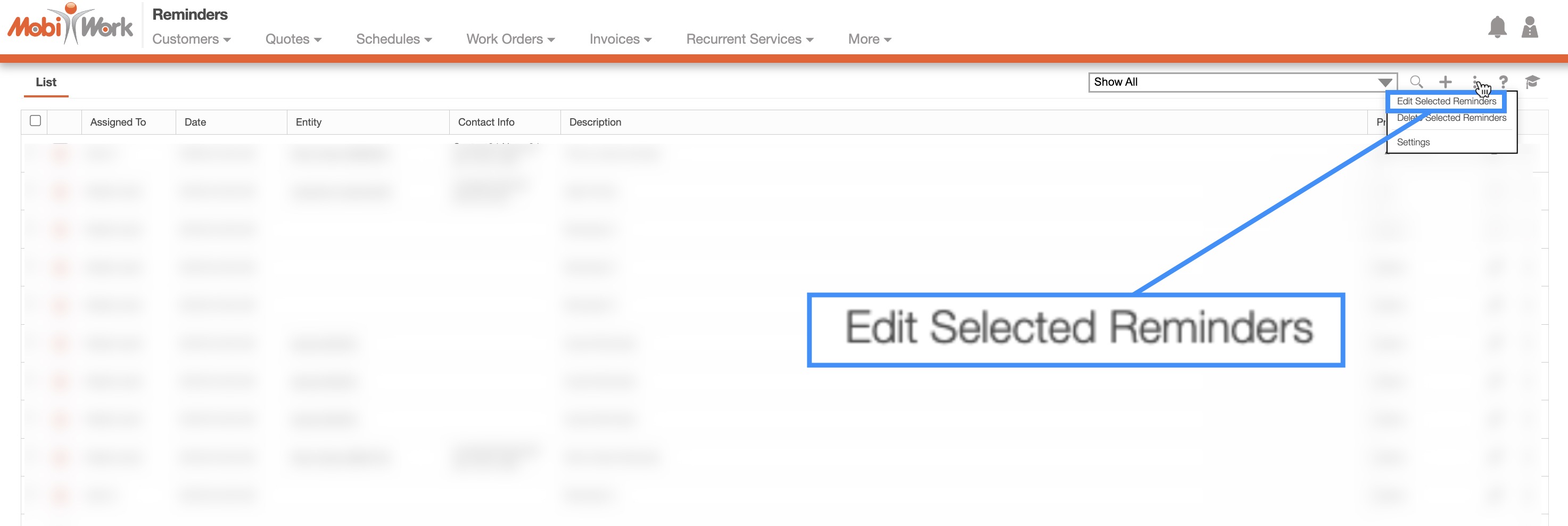 Note: Both the Reminders "List" tab and Customers "List" tab will have the "Edit Selected Reminders" option from the More Actions drop-down.