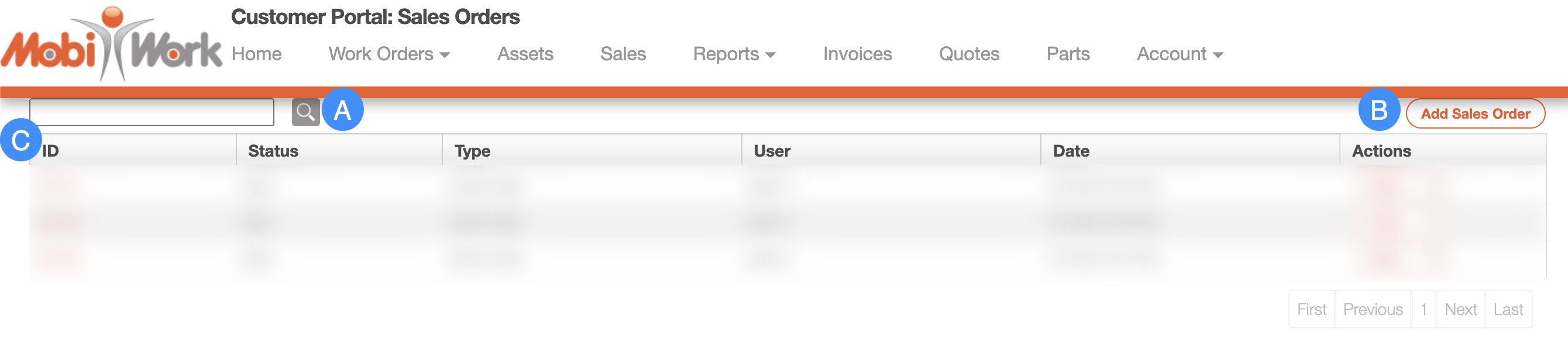 These columns are organized as: "ID," "Status," "Type," "User," "Date," and "Actions." The columns from the Sales Orders page are further defined below: