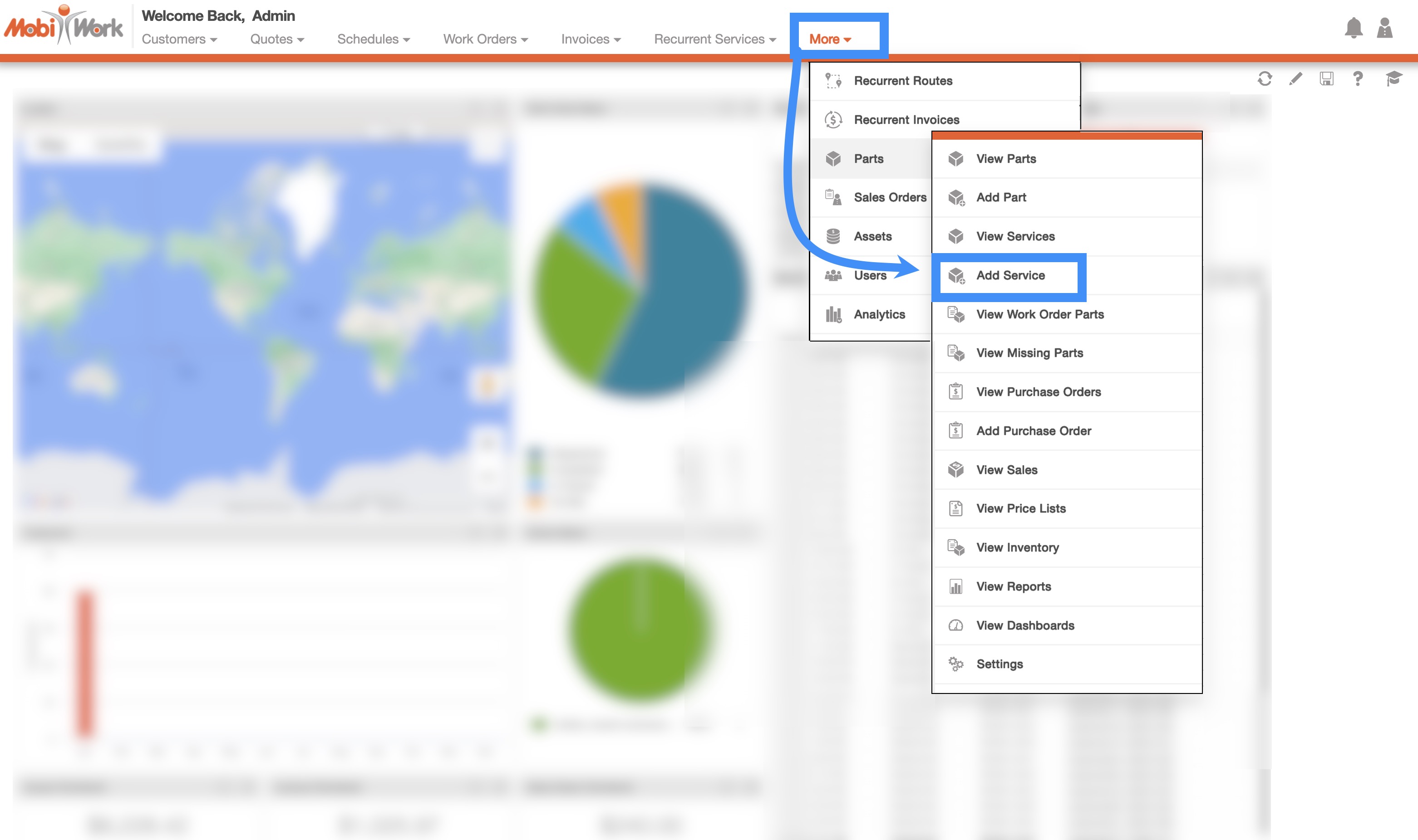- The fastest and easiest way to add a new service is by accessing the drop-down menu from the Parts feature located in your MobiWork menu: