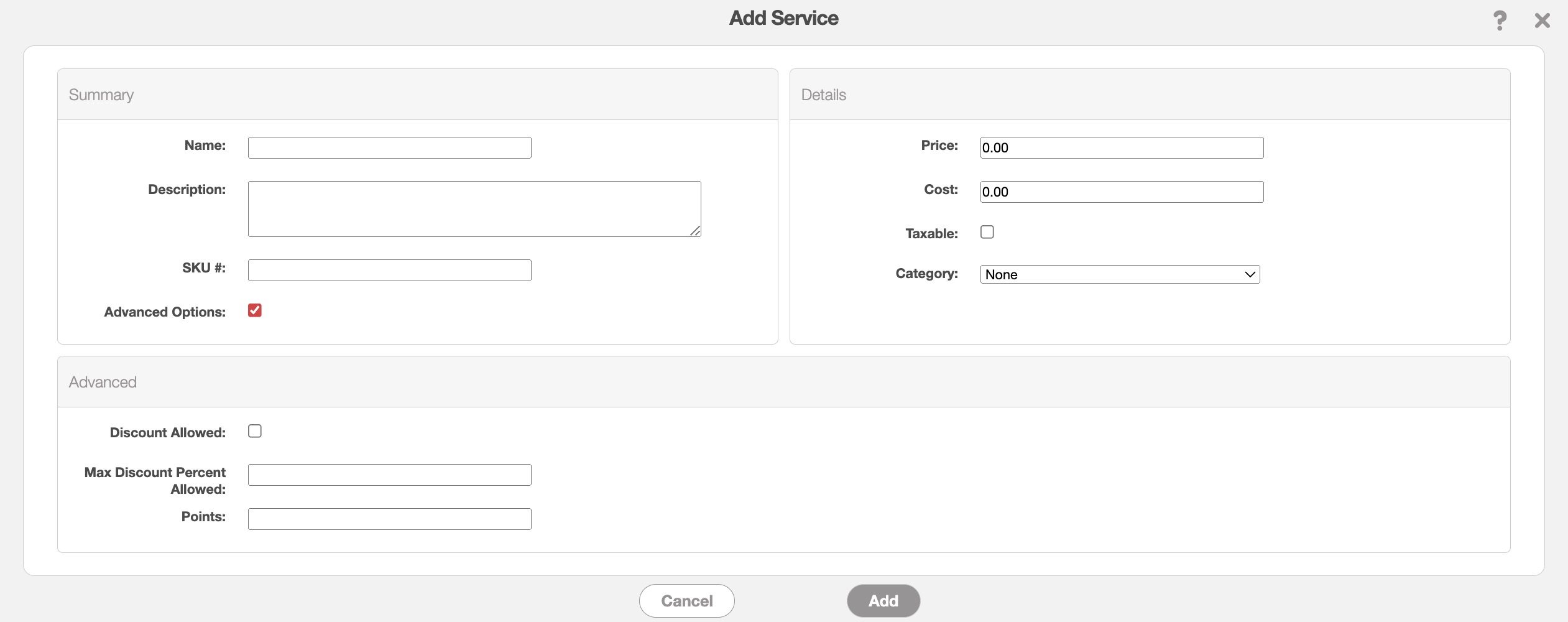 Regardless of the method that you choose to add a service, the Add Service pop-up window will appear. From this window you will be able to input if the product is a service, the name of the service, and more:
