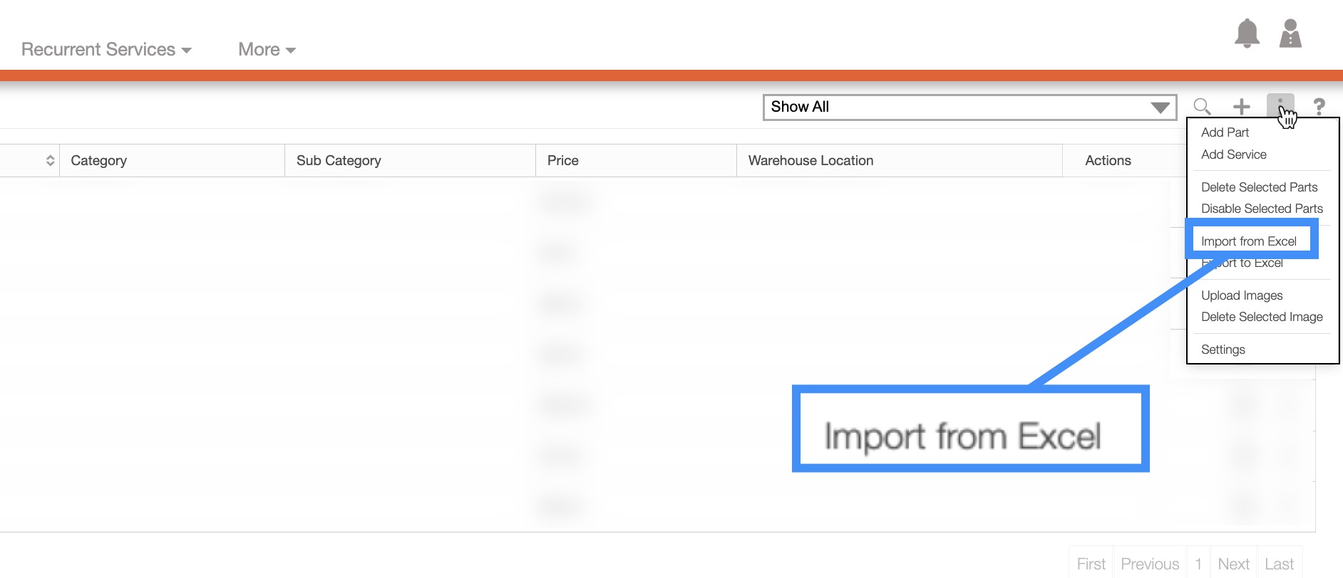 When you are on the Services feature page, select the More Actions button and from the drop-down click on the "Import From Excel" option: