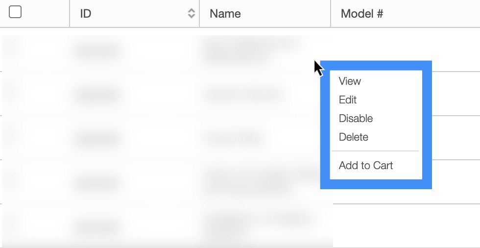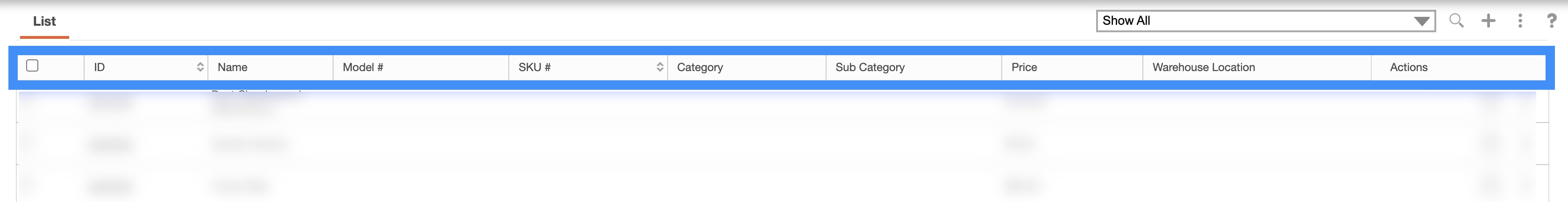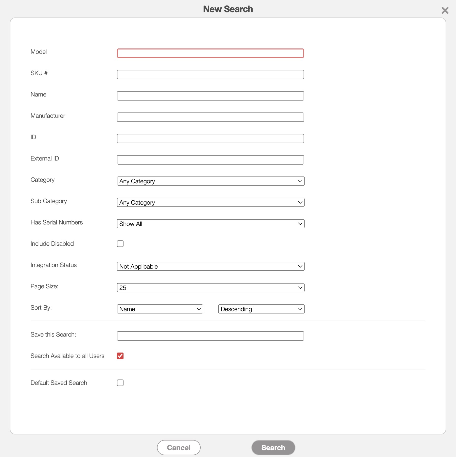 | "Sort By" | Sorts your search in ascending or descending order by: Name, ID, Created Date, and SKU. |