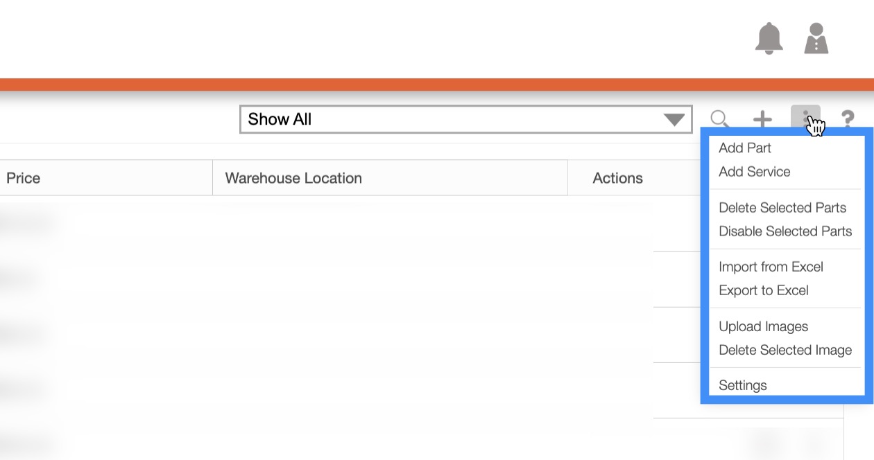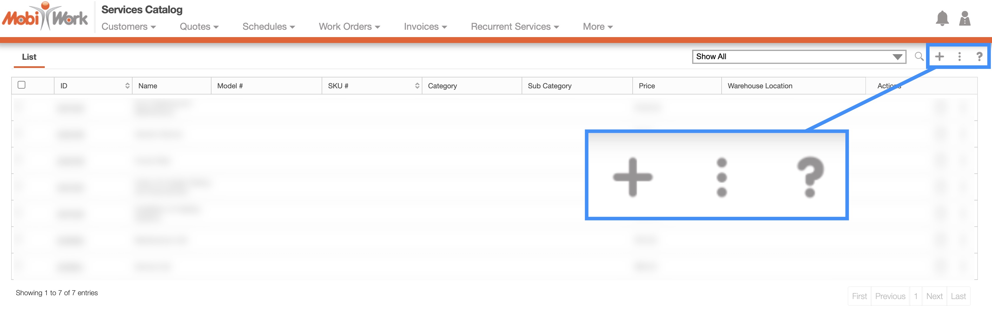 The More Actions button (represented by the three vertical dots) which will allow you to upload images, disable services, import/export from excel, and more.