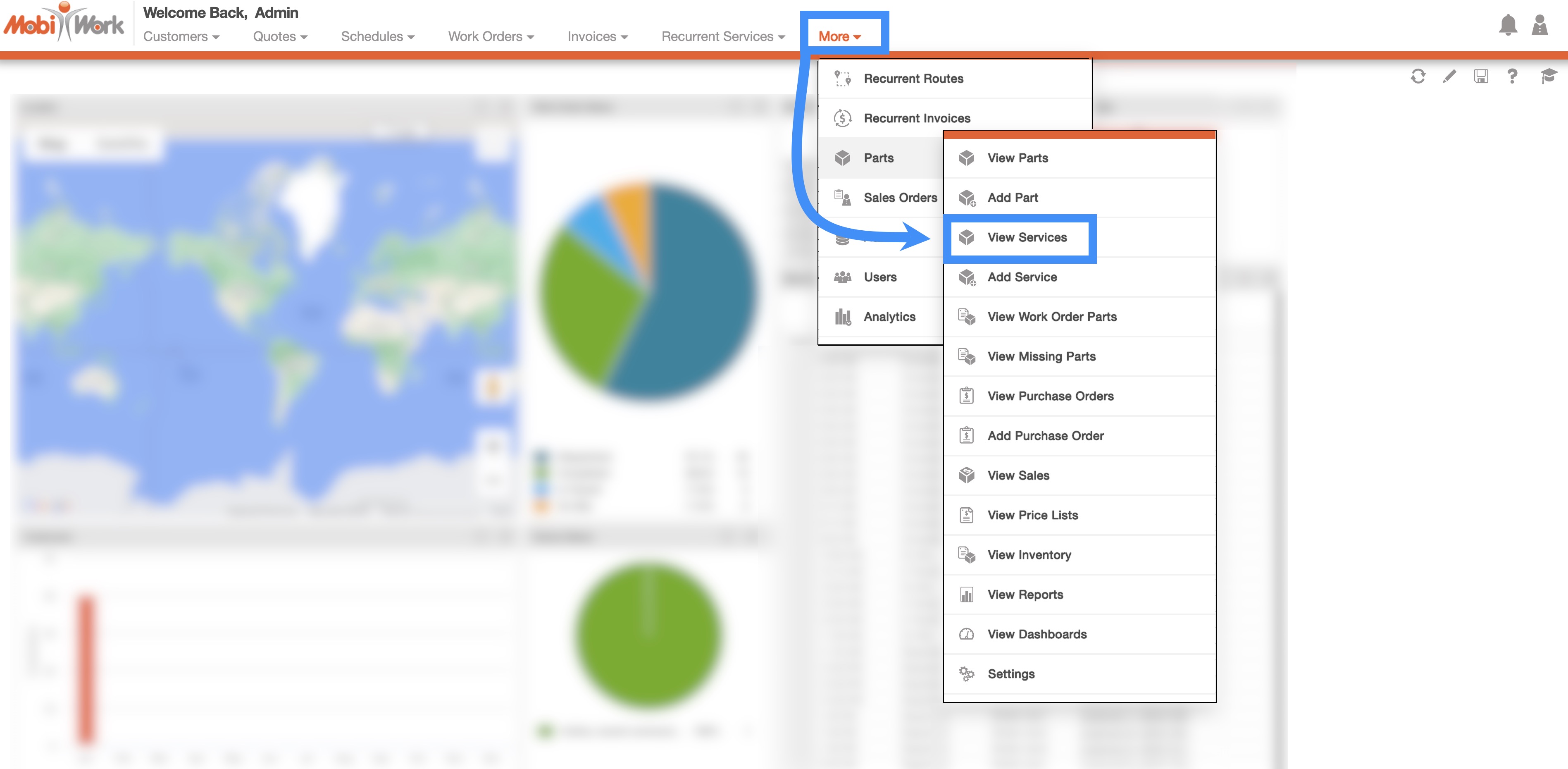 You can access the "Services List (Catalog)" page by hovering over the Parts feature from your MobiWork menu and clicking on the "View Services" option: