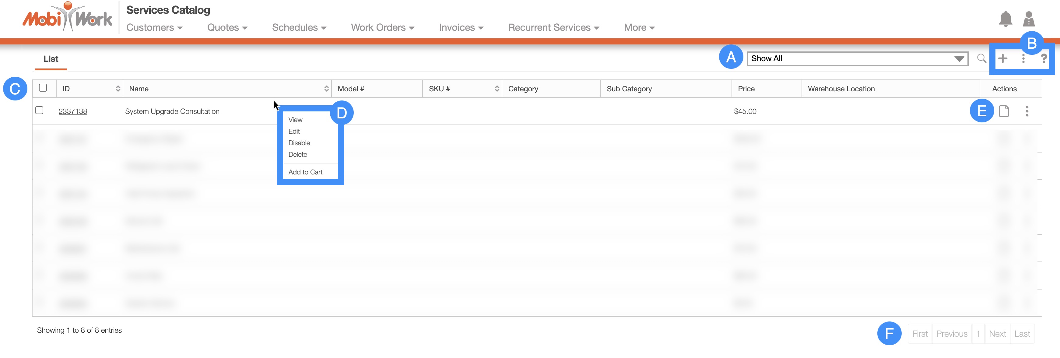 The "Services List (Catalog)" tab is the default view for both your services; the columns in this view will display the summary information for your services and allow you to view, edit, and more.
