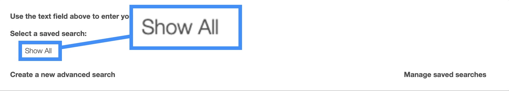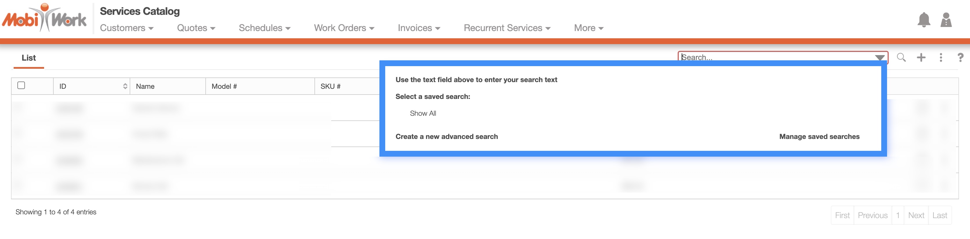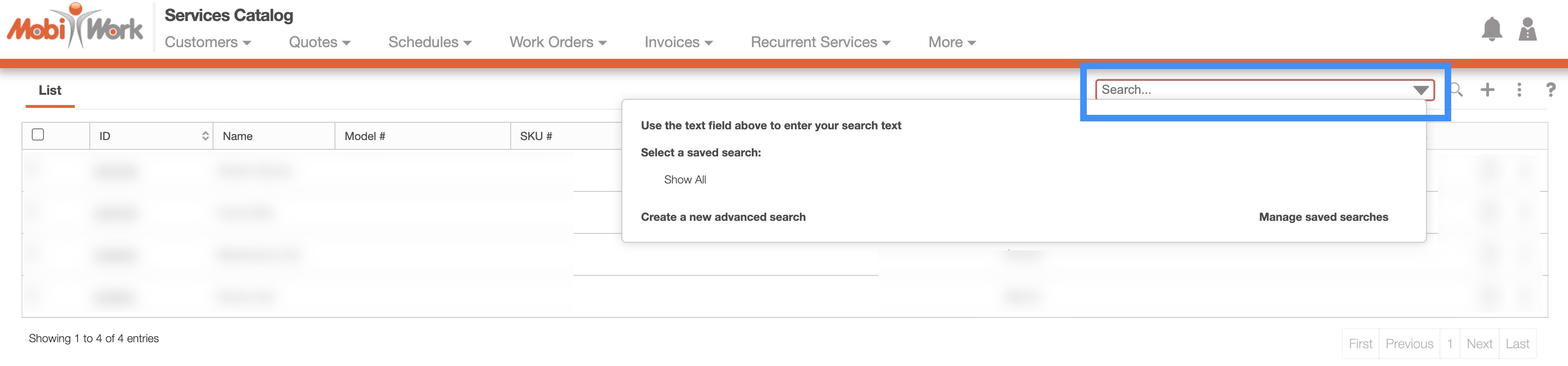 Saved searches are a powerful search tool where the search-criteria has been saved for future use; to access the saved searches drop-down, click in the search bar. The default saved search for Services is the "Show All" search.