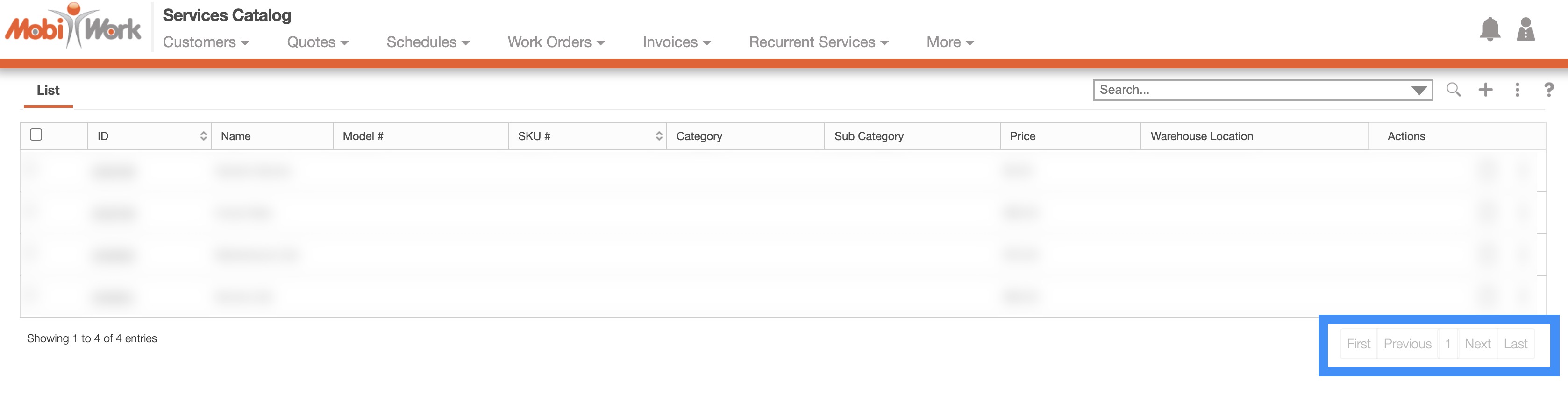 To navigate through these pages, use the First, Previous, Next, and Last buttons located towards the bottom of the "Services List (Catalog)" tab.