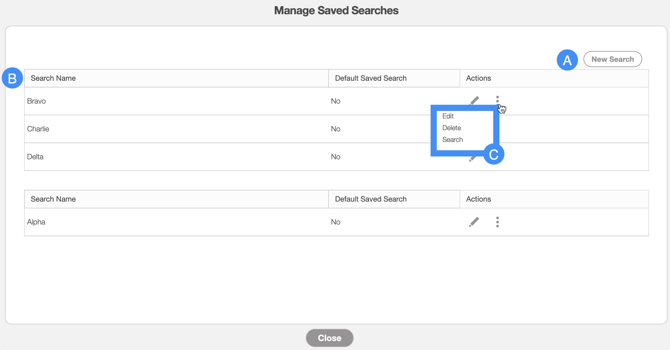 To manage, edit, or remove any Saved Searches you can access the "Manage Saved Searches" option in the drop-down menu; the Manage Saved Searches pop-up window will then appear: