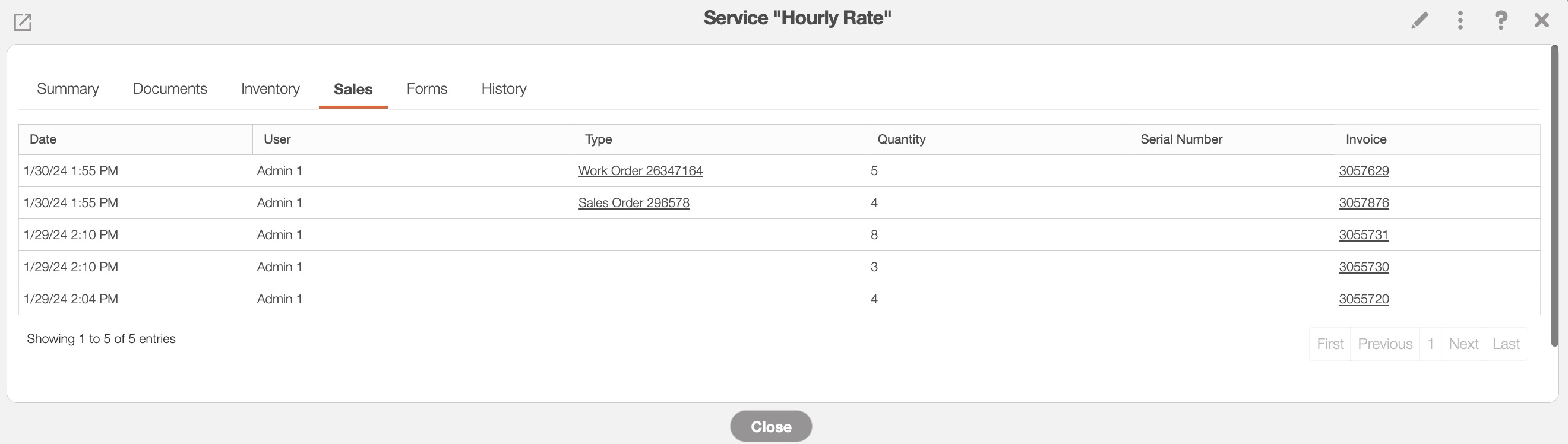 The "Sales" tab will allow you to view the sales orders and invoices associated with the service. This tab will also display the quantity of items sold, the date of the sale, and the user who inputted the details of the sale.