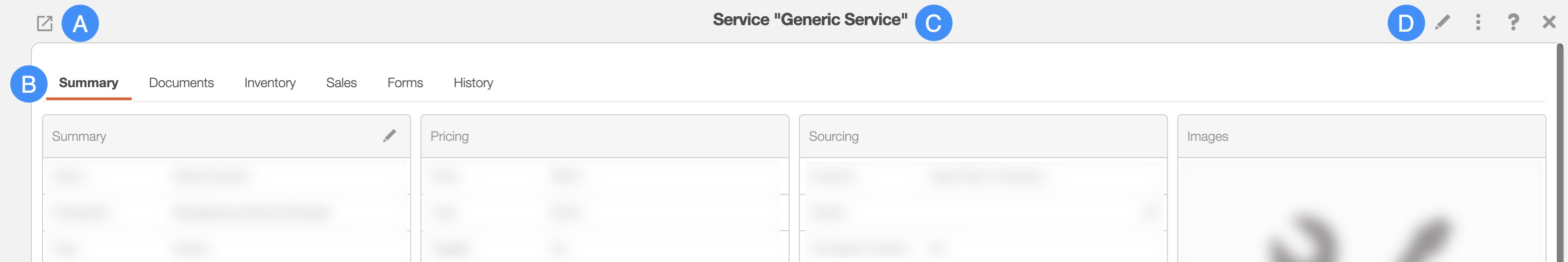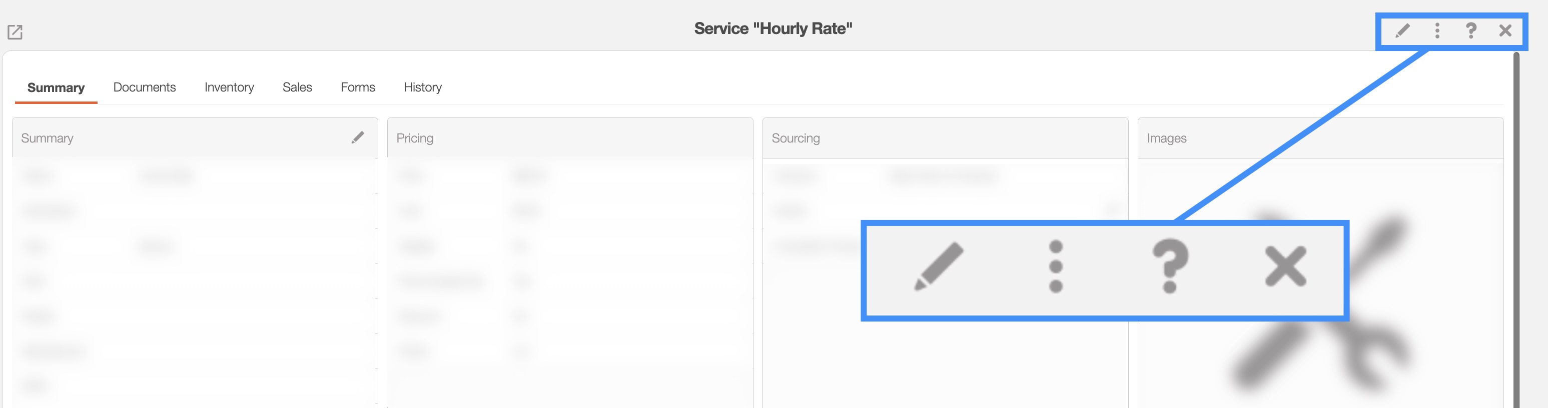 The Service's Upper Right Corner Actions can be found in the top-right corner of the View Service pop-up window. These actions are located in this section, regardless of the tab you are on: